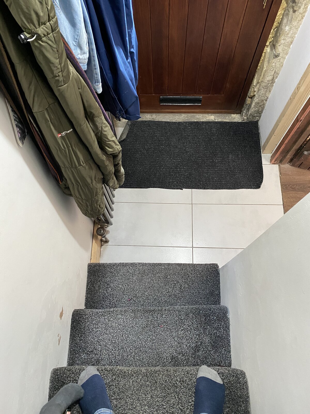 Approximately 1m from the last step is the external door. There are no issues with the paint around the door or beyond the steps to indicate its an ingress or damp type of issue.