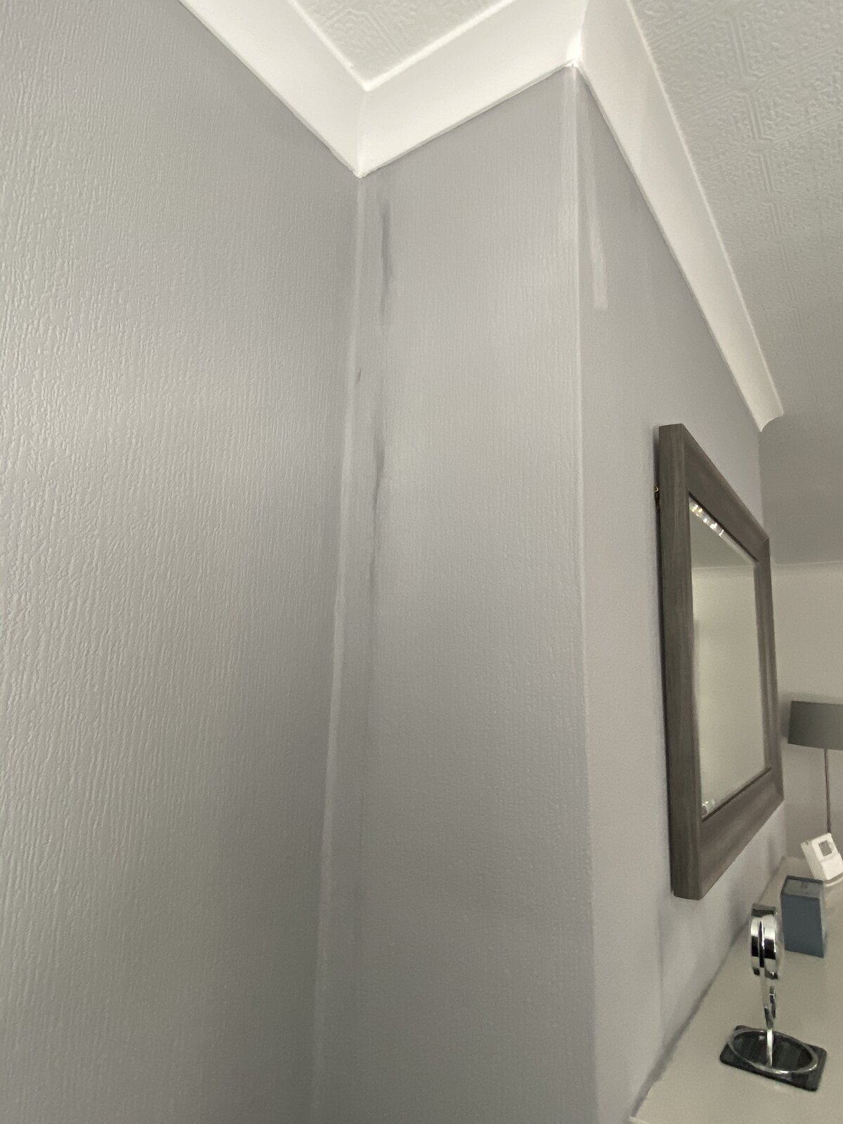 This wall has recently been papered and then painted in a Dulux grey Matt paint,