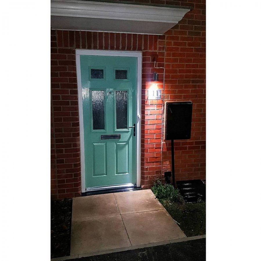 This is a new plastic front door which was Black. I gave it a coat of oil based grey undercoat, then two coats of Valspar water based gloss. Looks great !!