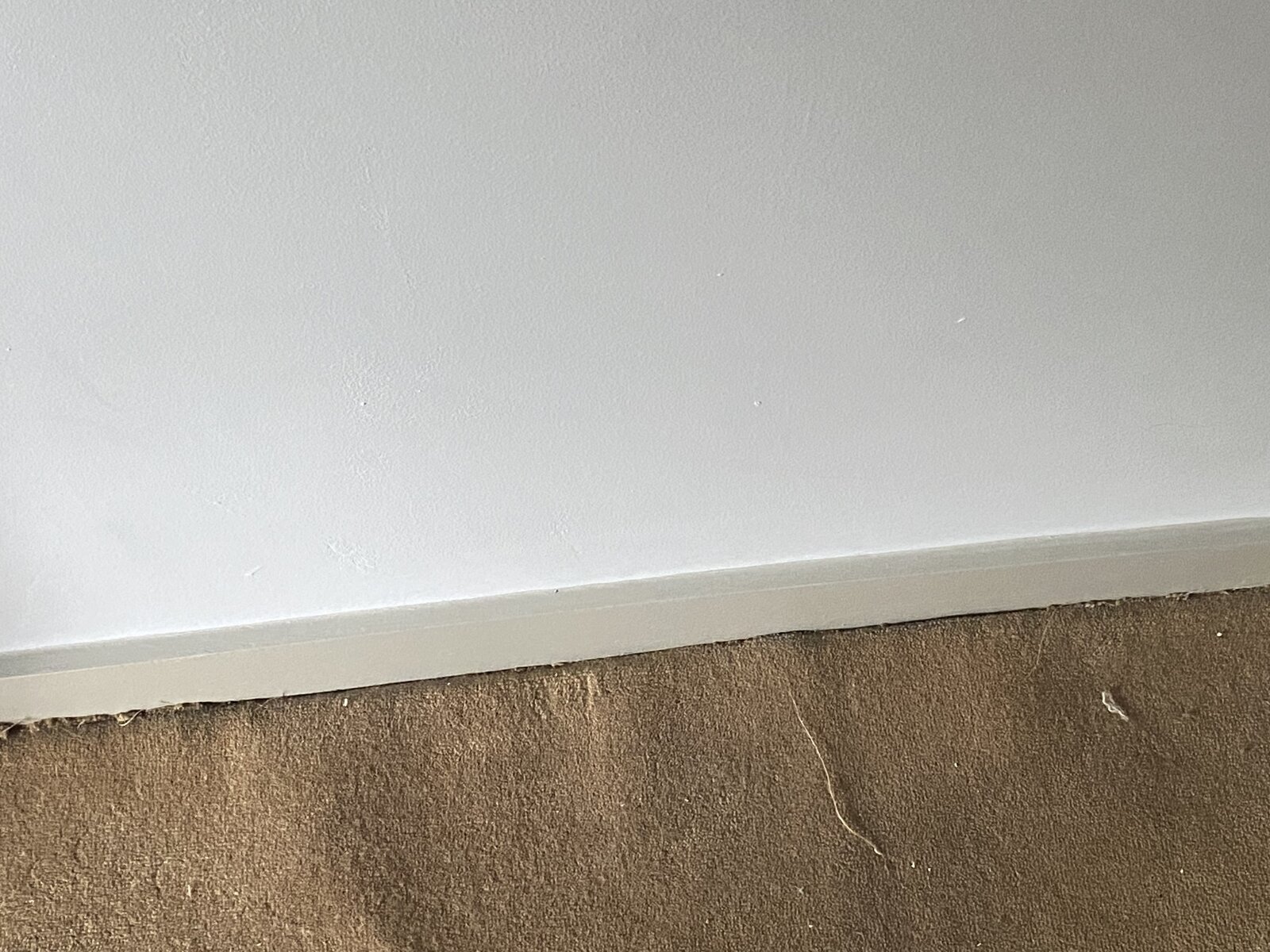 It’s quite subtle but immediately above the skirting the wall paint looks almost bright white which glows. It looks like white caulk has been applied after and not painted over. Therefore, when you look at the skirting you get this white glowing band all the way along. Must be something to do with low the light is interacting? Maybe a difference in sheen?