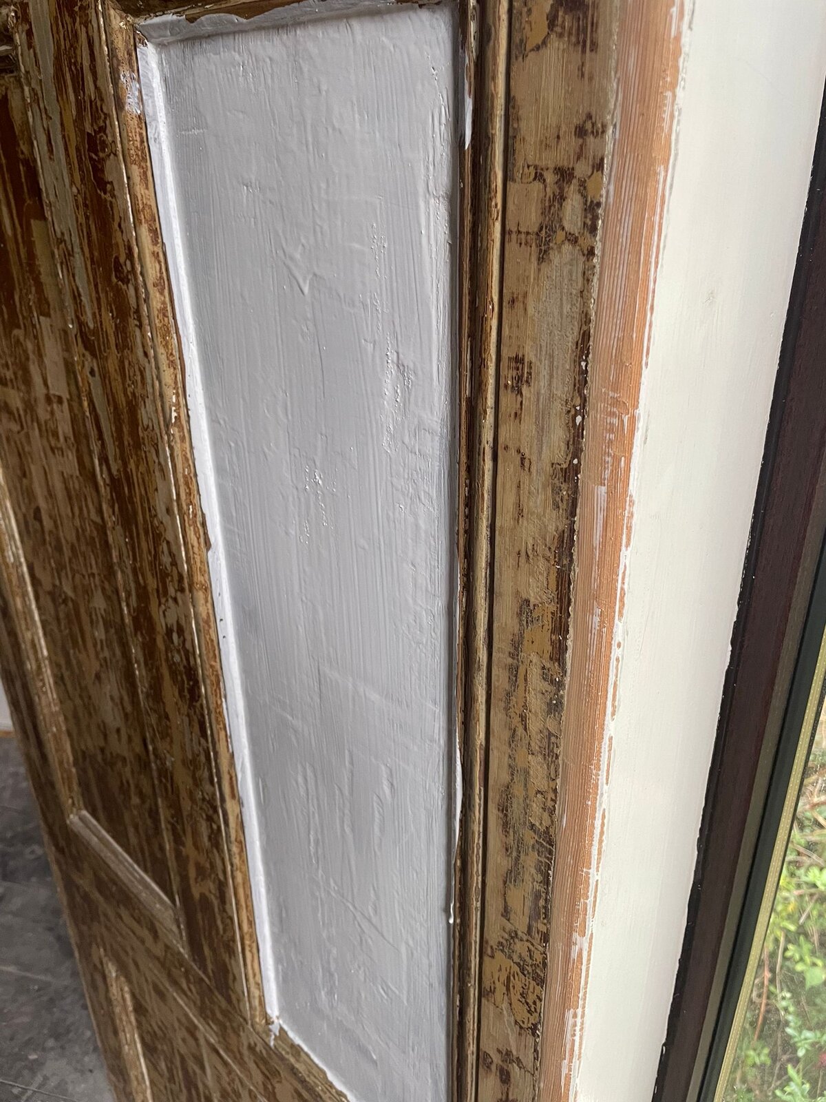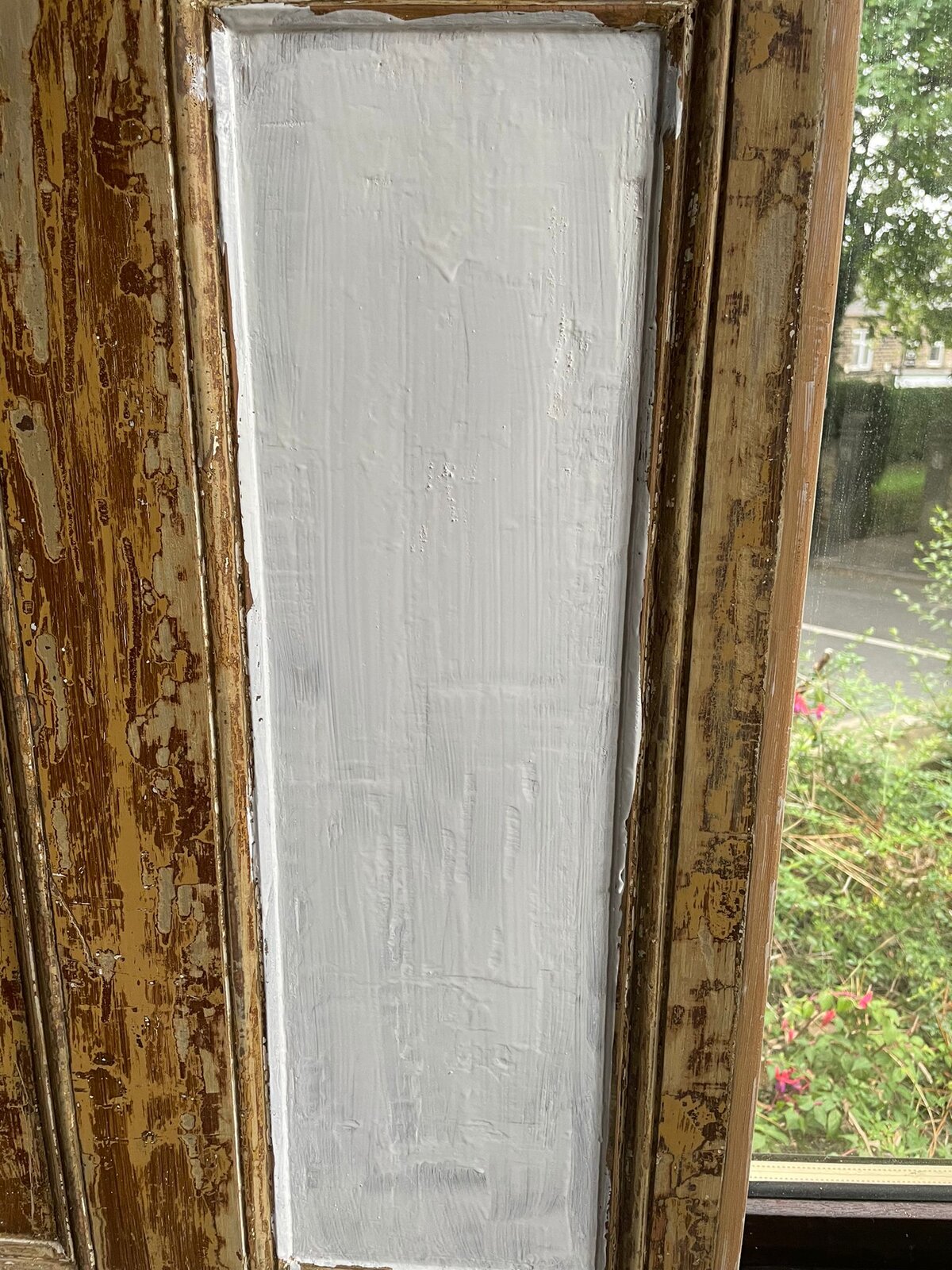 We stripped back years of lumpy gloss paint off these old panels around the bay window. Took forever, and still not got a totally smooth finish. We have sanded it down by hand and tried coating with a primer to see if that hides it but you can still really see the uneven texture in places