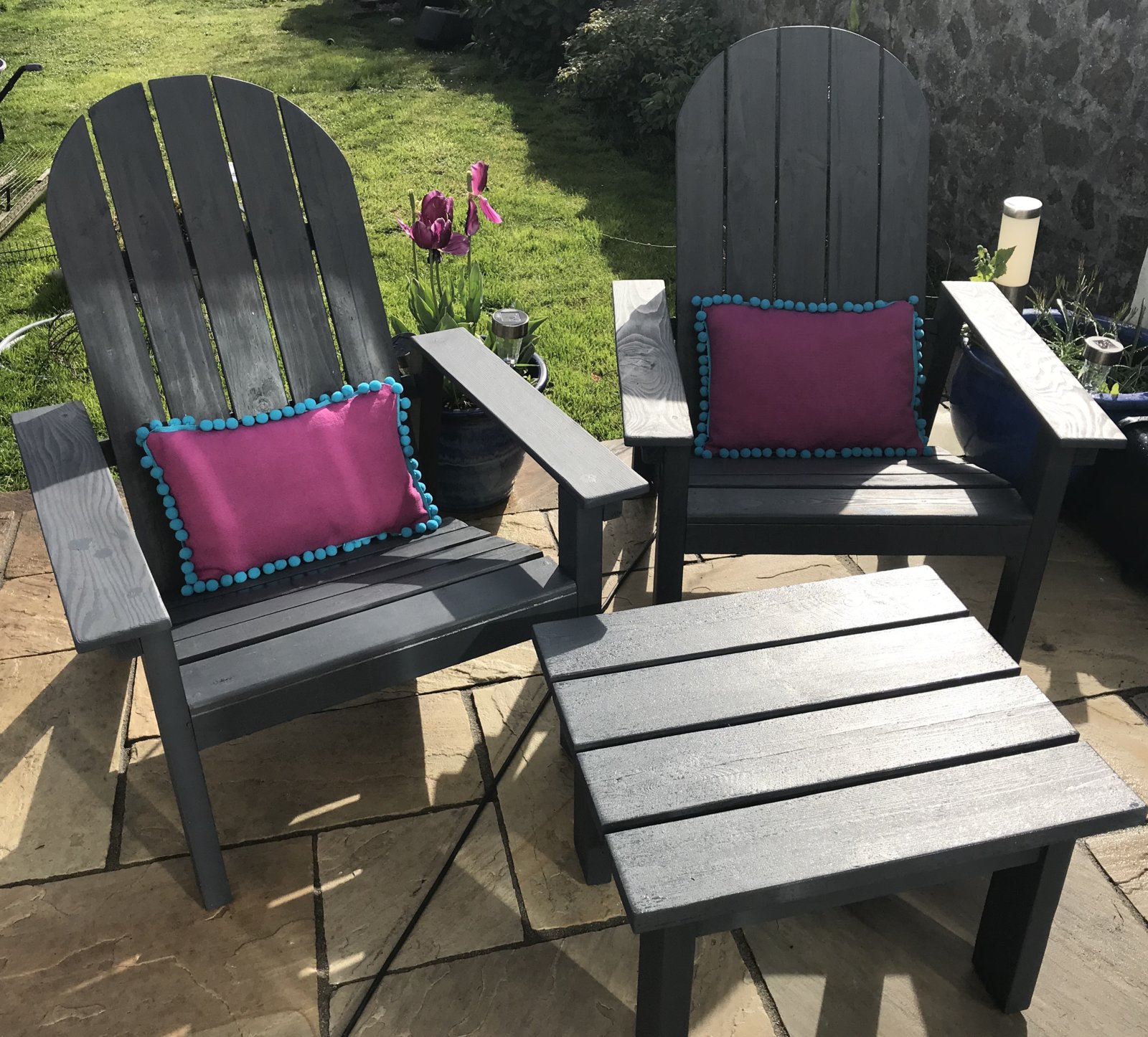 I made these garden chairs with pallet wood, recycled 2x4, scrap wood and the table was made with recycled 2x4 and salvaged wood from the Ice Prince ship that sunk.