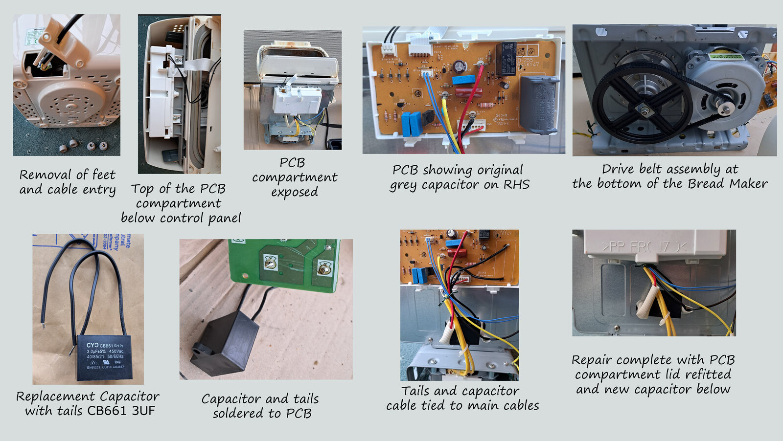 What to do when you have never seen a bread maker, let alone used one, but your 88-year old aunt thinks you can fix anything! The answer is simple and if you have found this thread you are already a good way to solving the issue. If it is not a loose/broken drive belt, then it is likely to be the capacitor.
