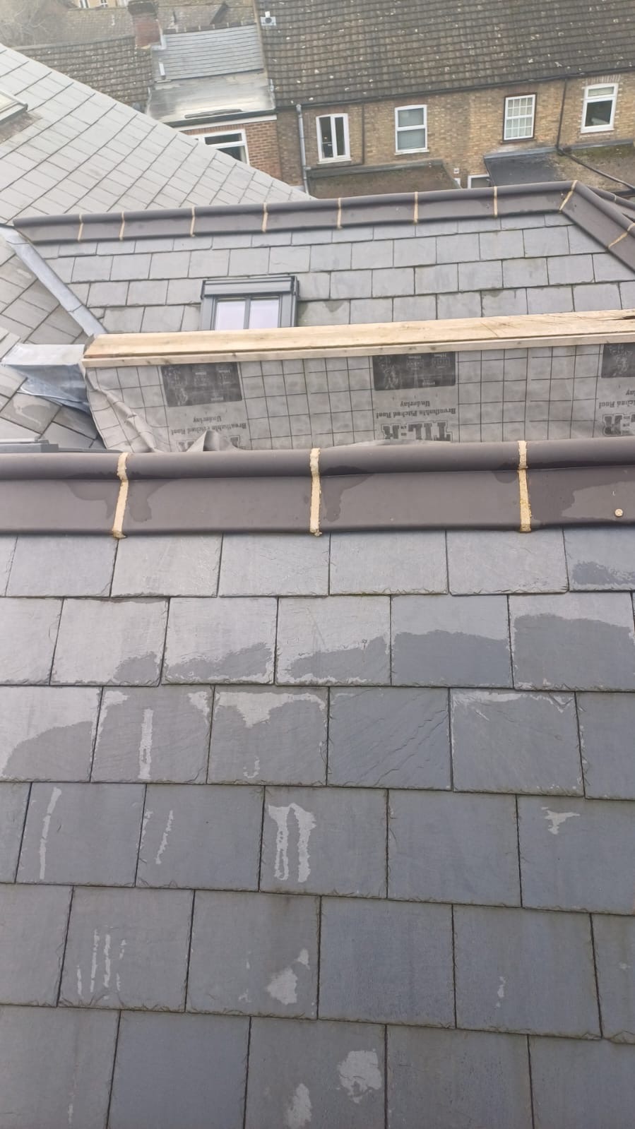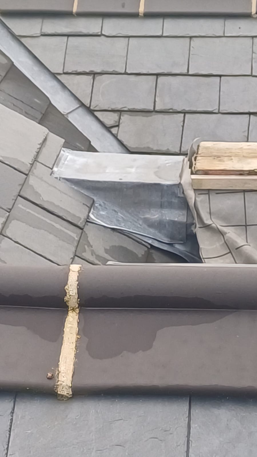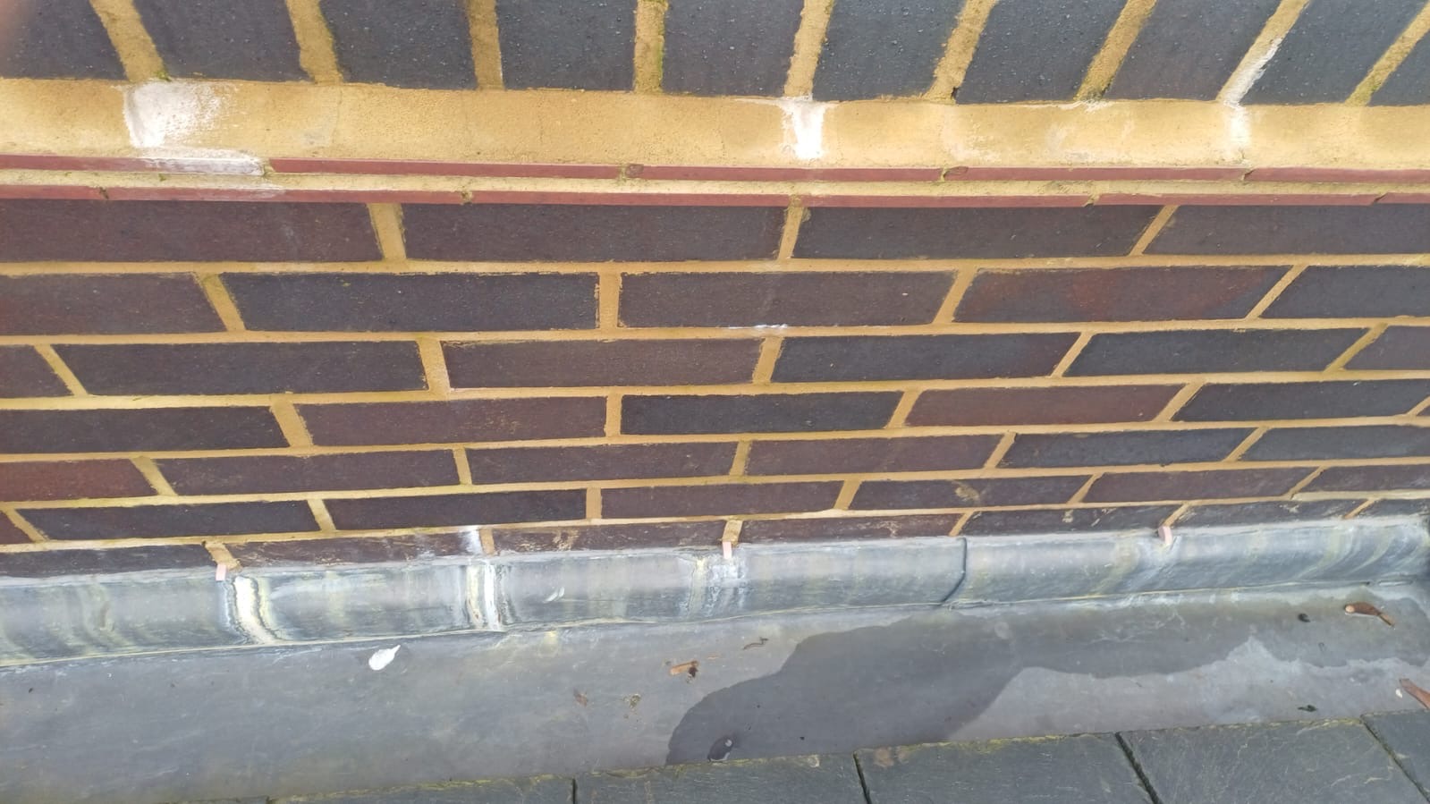 On the pitched roof the Lead work is wrong; there should be 'Soakers' on each course of tiles Lead should not be over tiles. The roofer has cut the Step flashing in nicely so seems strange that he laid the lead over the tiles instead of using soakers. Without soakers water will track sideways and into the wall. See