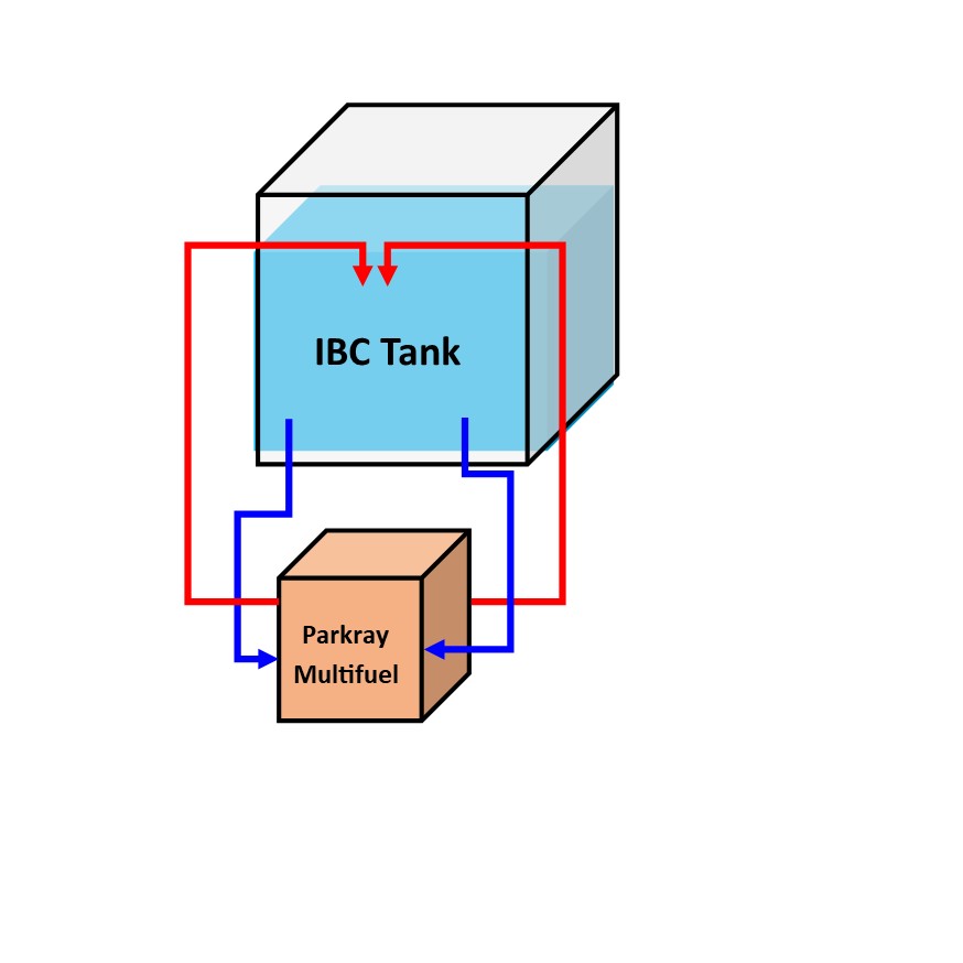 My plan would be to clad the IBC tank in left over fence cladding, place the Parkray close (but not too close!) and connect copper pipe into the IBC tank at a low point (for the colder water intlet) and at a higher point for the higher temperature water outlet (as a result of convection).
