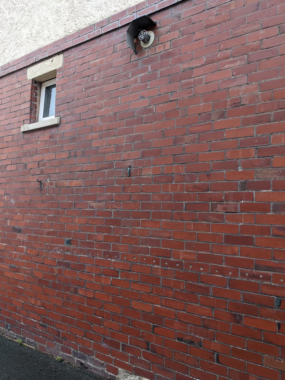 Here's a picture from outside that wall. Nothing immediately obvious aside from the boiler overflow / vent and the brick 'lip'. Oh and the poor pointing.