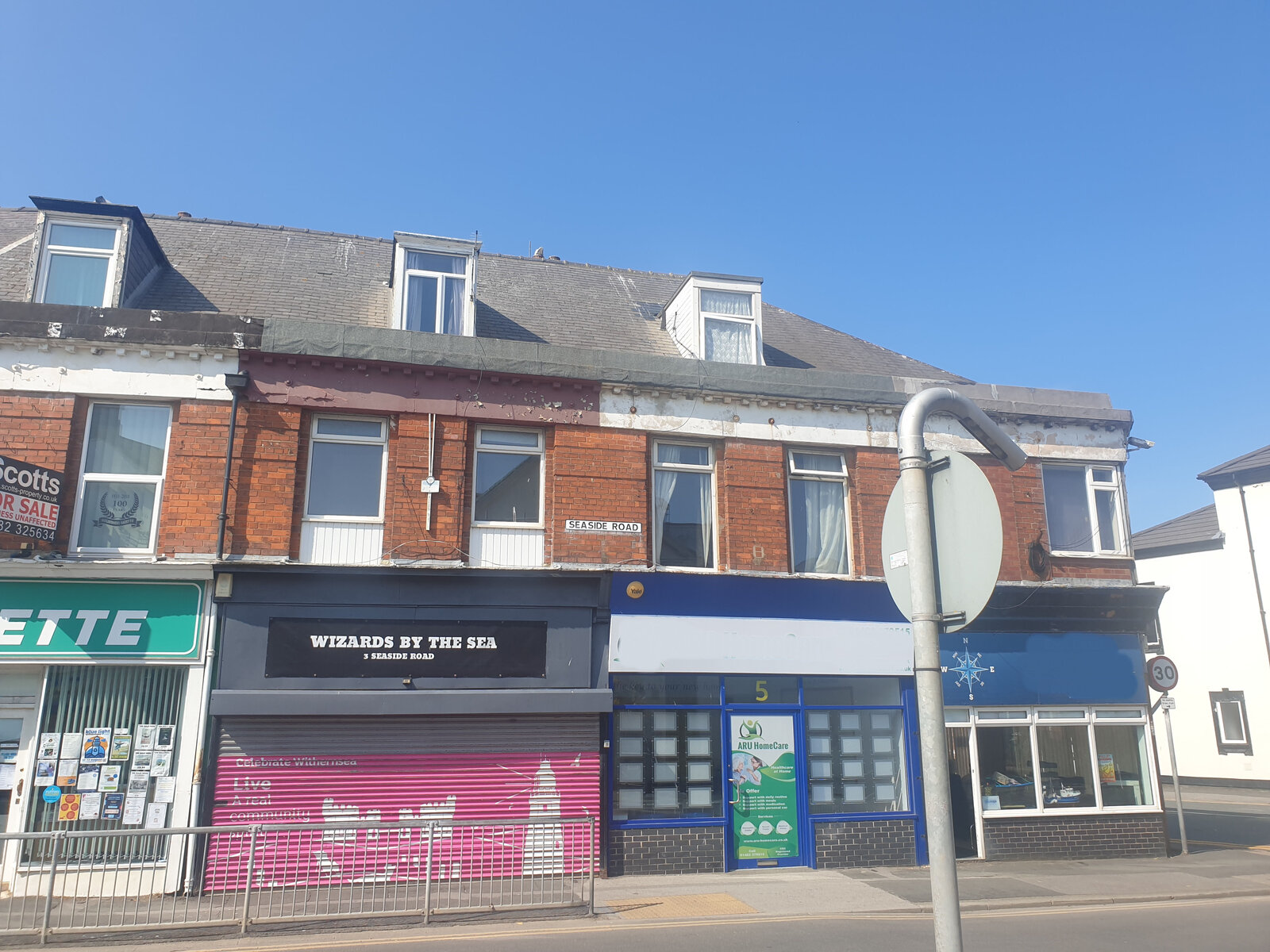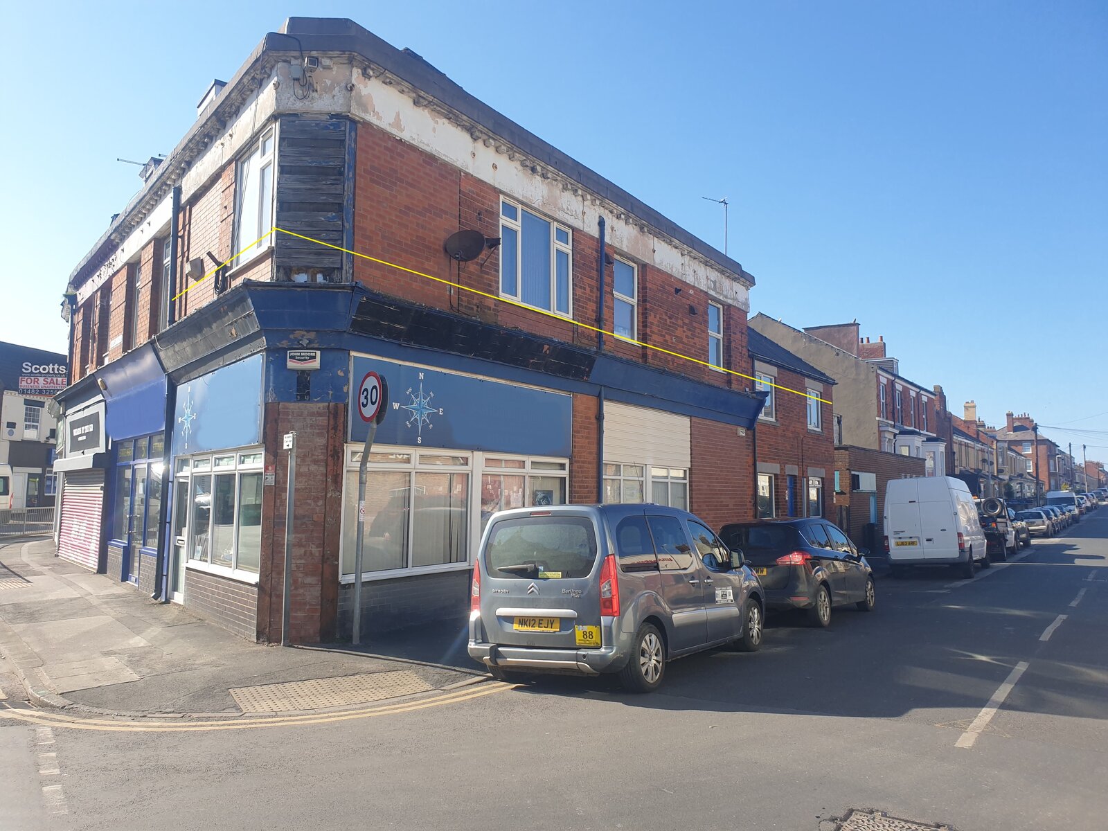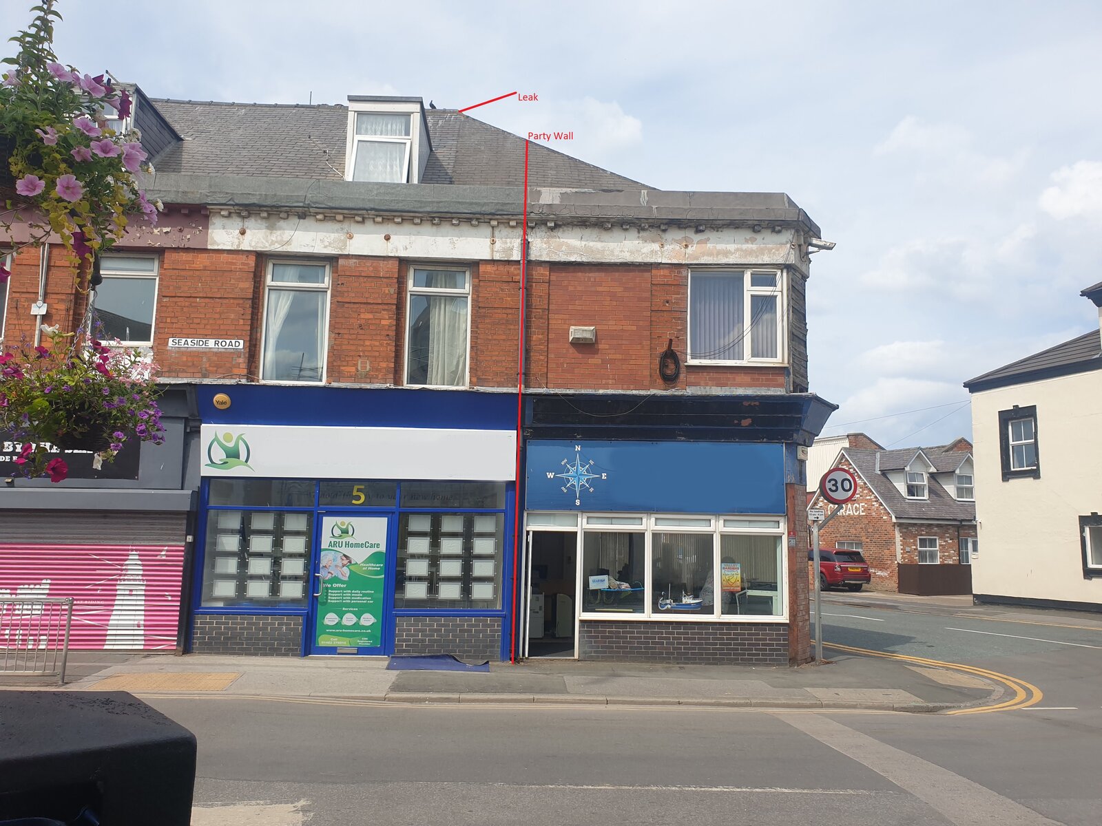 Roof line .Your party wall is unlikely to be where marked on you photo as it’s a triangular corner plot which would mean your flat? Is a tiny triangle ?
