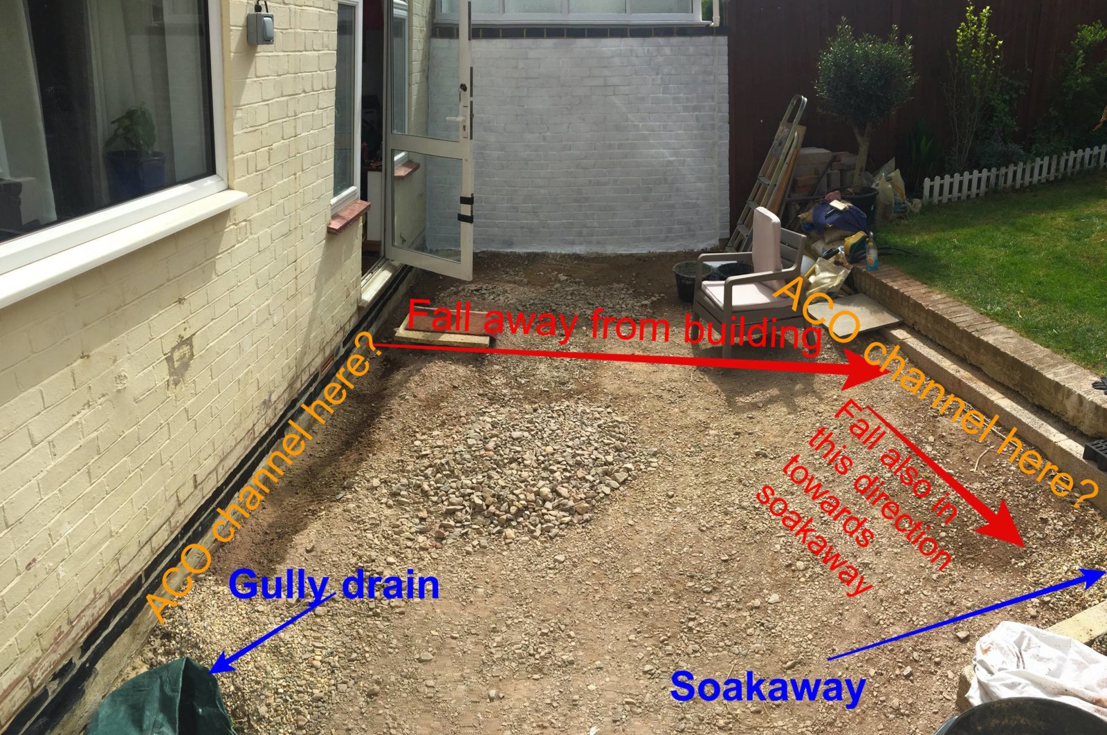 I am after some clarification for Aco drain location. I have attached two pictures to show the Bifold doors which will have a sandstone pation with a fall toward a retaining wall.