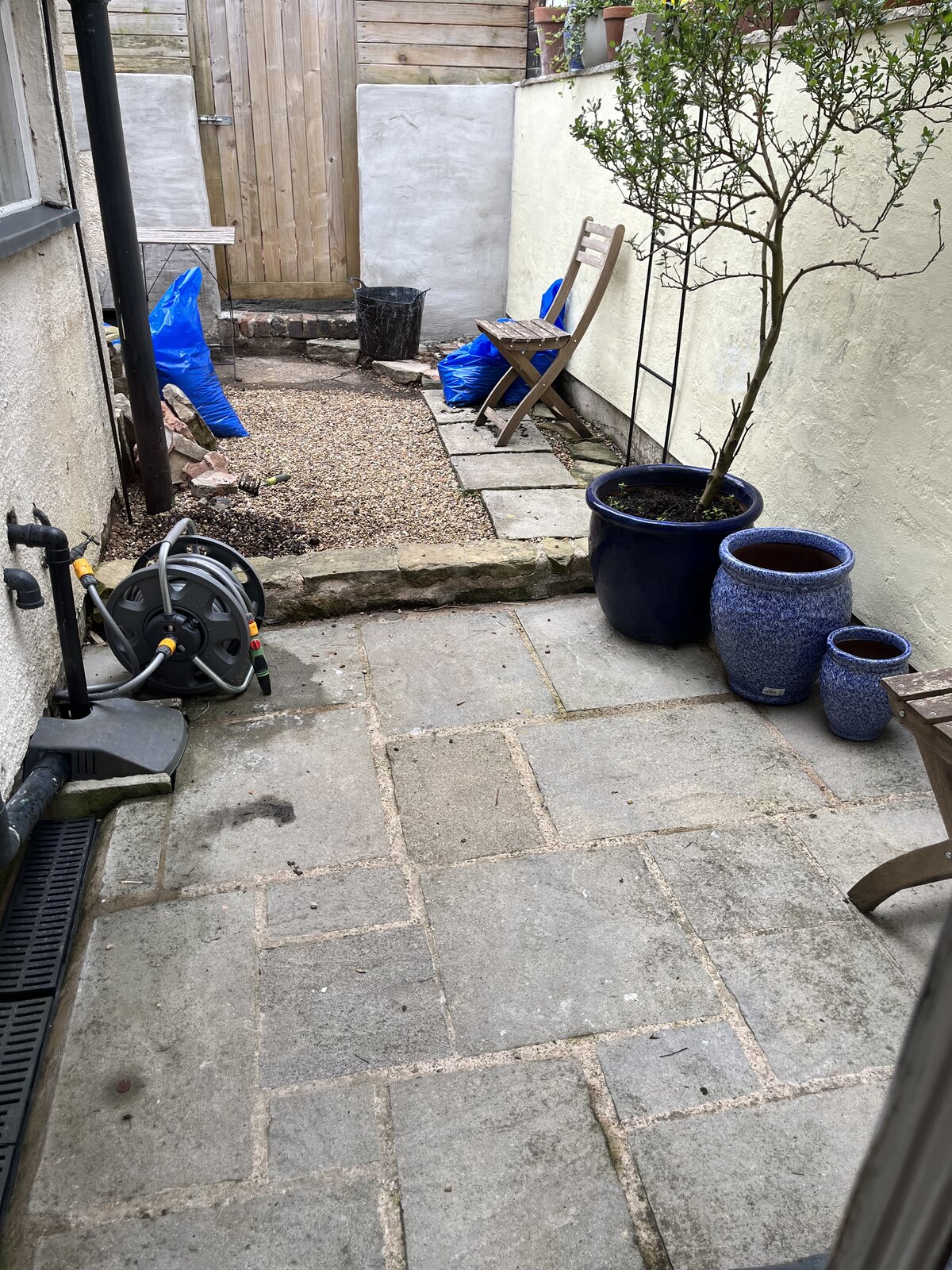 Hello, I have recently moved into a Victorian terrace with a small back yard which has a small patio area and a slightly larger pebble-floored area. The patio area is clearly sloping towards the house and has a drain to deal with the runoff.