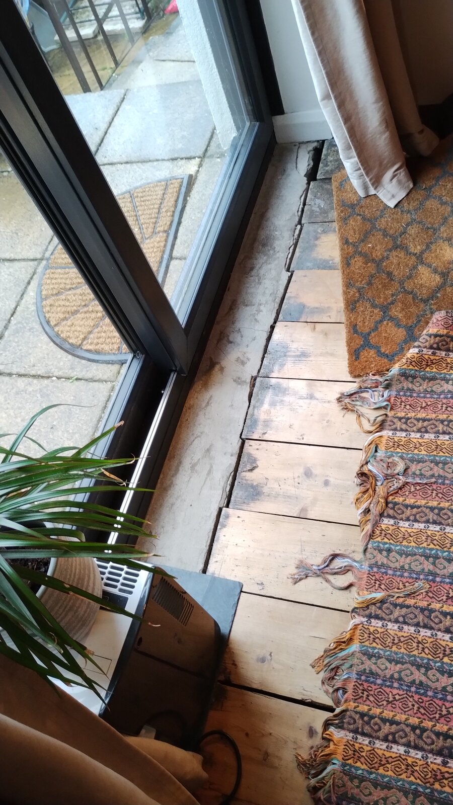 We've just moved in this year. Our patio door looks to have been installed on a concrete slab that bridged the cavity wall below.
