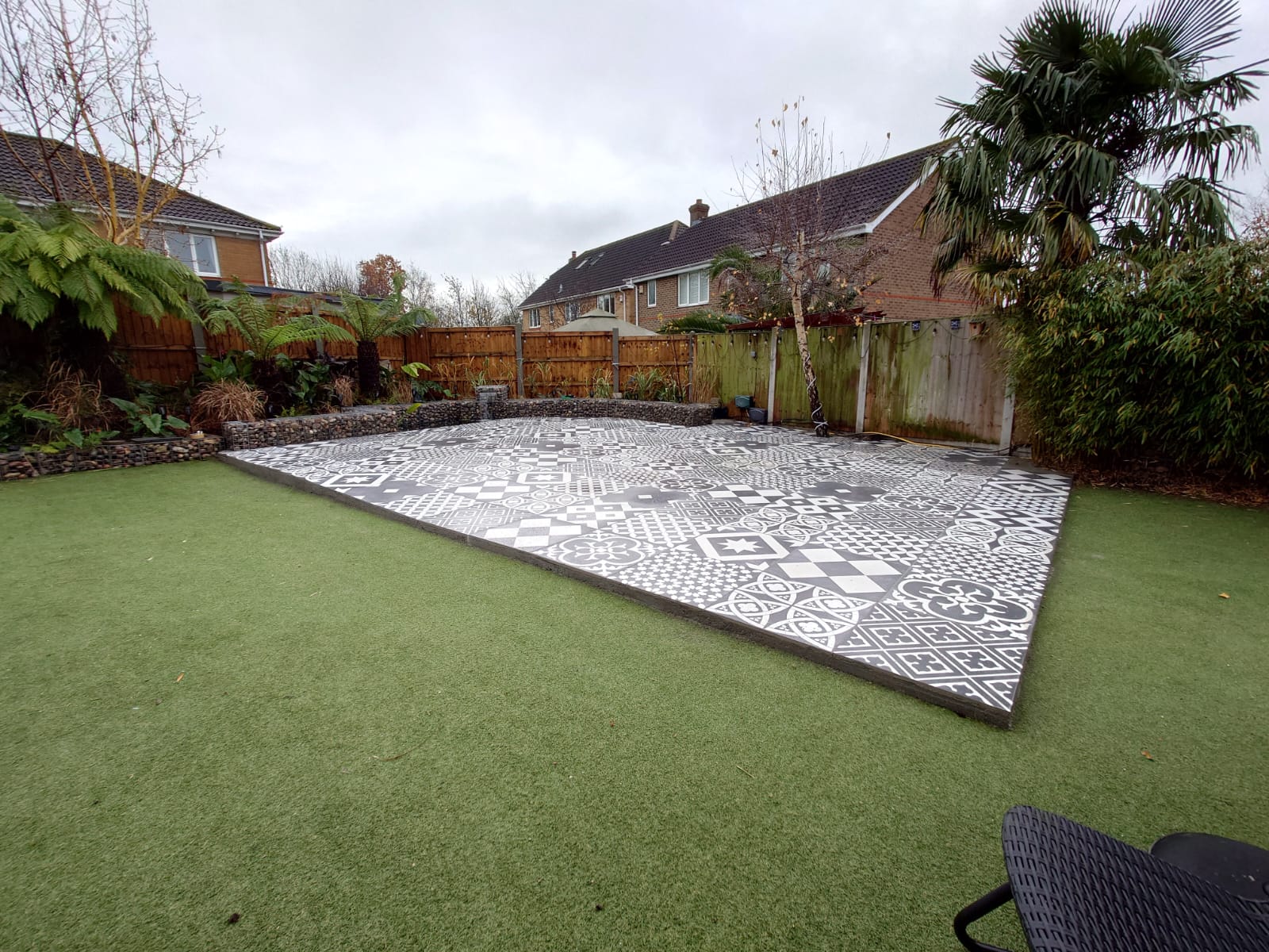 We have seen some nice porcelain tiles 600 x 600 , ive uploaded some pictures of what i want it to look like, i'm clearing the area today but feel like i'm out of my comfort zone completely.