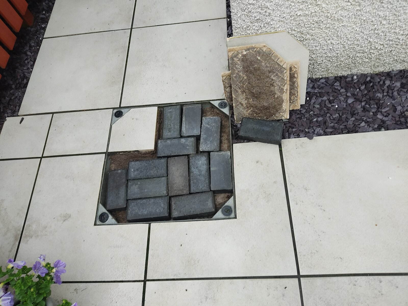 My paving over my manhole cover has worked its way loose and so I chiseled out all the existing mortar just seeing if there is anything I should do other than fill with fresh mortar and stick paving back down see.pic