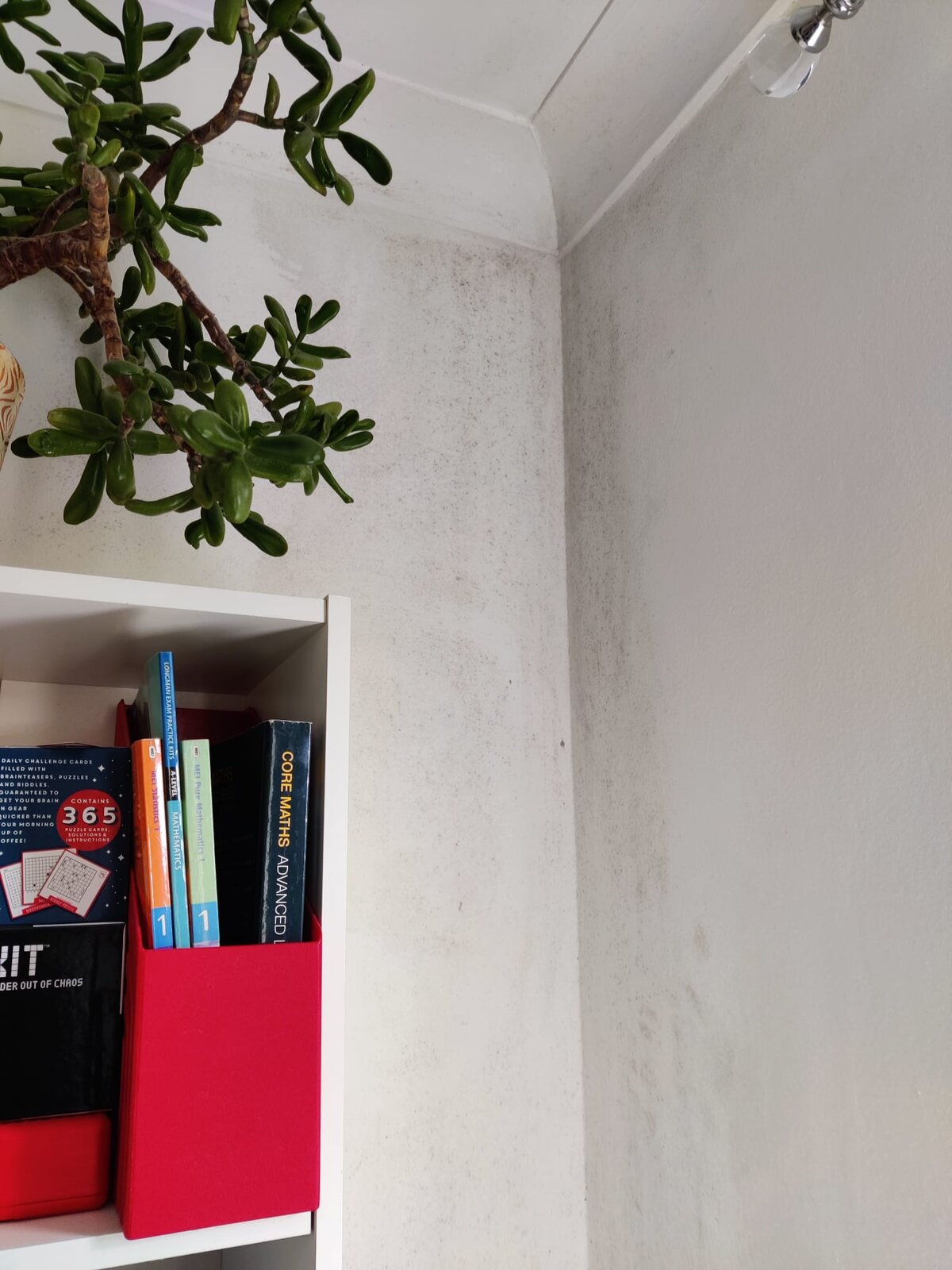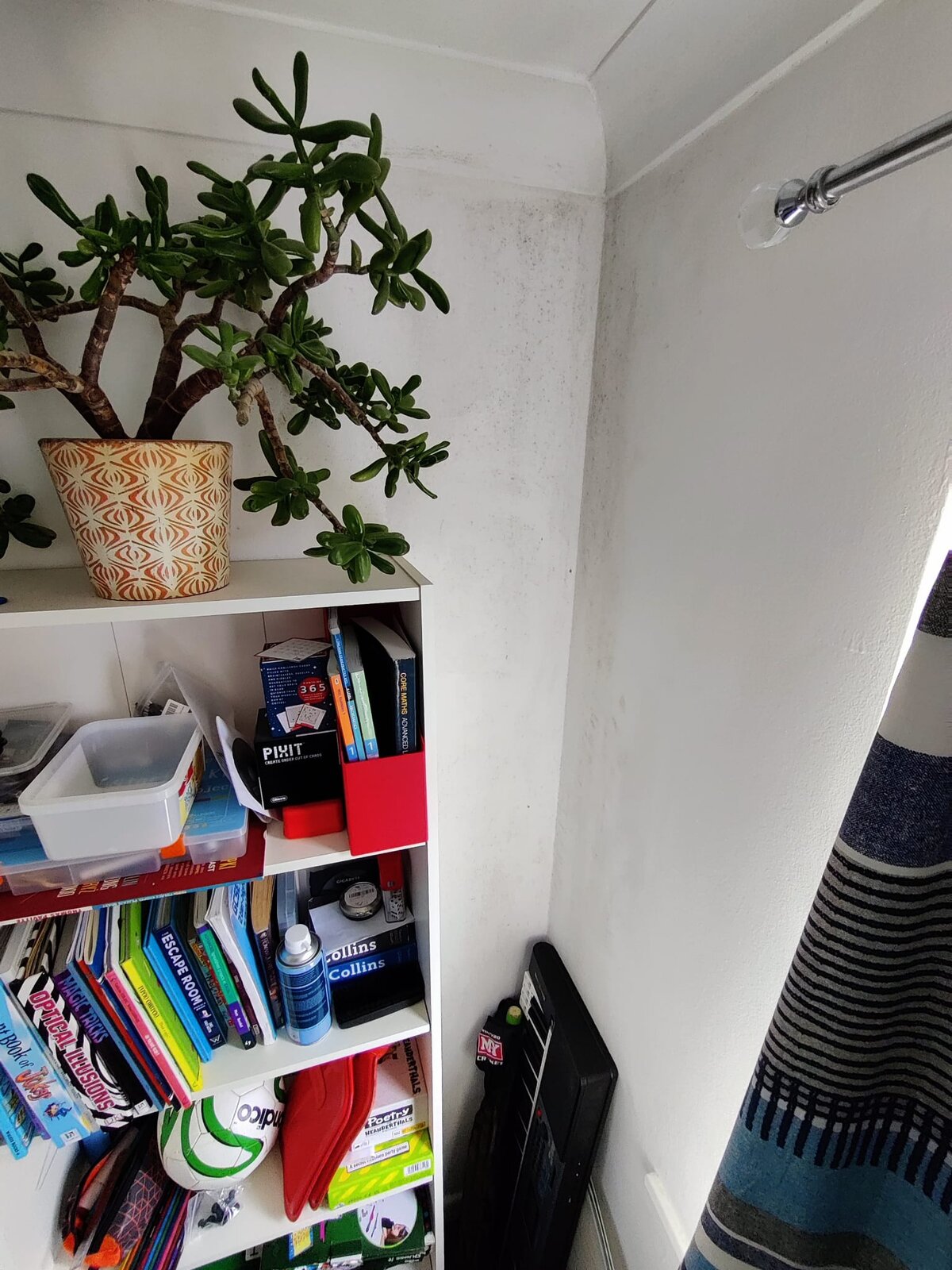 I need some advice regarding a recurring dampness problem in my son's room. The 90-degree corner near the window is always damp, likely due to the lift section behind the wall. Despite multiple repaints using basic stain stop paint, I'm still battling black dirt and mold.