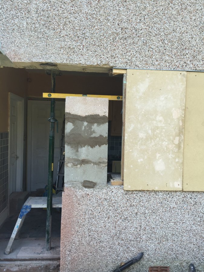 Normally this is very straightforward but unfortunately the window was in the way of the new doorway so has been taken out. Now a smaller window needs to be installed. However before that can happen a little bit of a wall needs to built. Which has already been started.