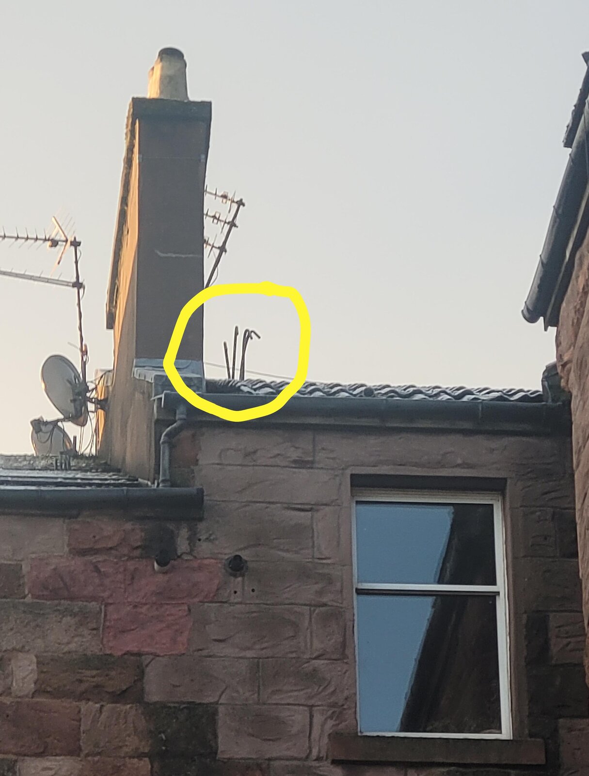 We live in the top floor of a tenement building and spotted these pipes which protrude a fair bit through the building's roof - they are definitely pipes, about 22mm width, look to be copper, and they sound hollow when tapped (and can be moved/are light). They run through the attic and then inside our flat down the inside wall (to the left of the window looking from outside), and at least one then runs under our floorboards (I can't lift/follow where they go from there). We're wondering what, if any, purpose they serve now and whether they could be removed. Does anyone have any ideas? I haven't seen any protrusions similar to this in any other tenement flats, tho some buildings look to have short stubby pipes protruding (including the building to the left, just under the dishes).