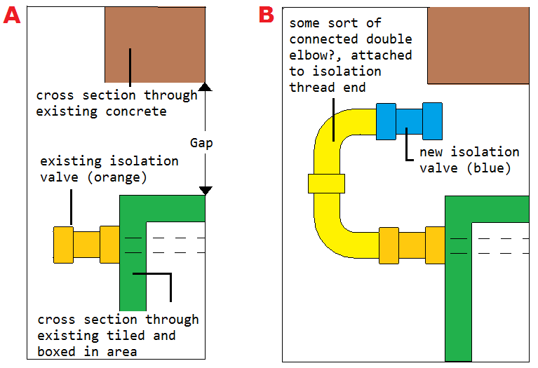 Wanting a way (as 'B') to put some sort of thread connected double elbow (ideally without pipework between) and another isolation valve thread connected to elbow as dont want to break in to boxed and tiled existing area. Cant move existing isolation valve, so only got thread end to work with.