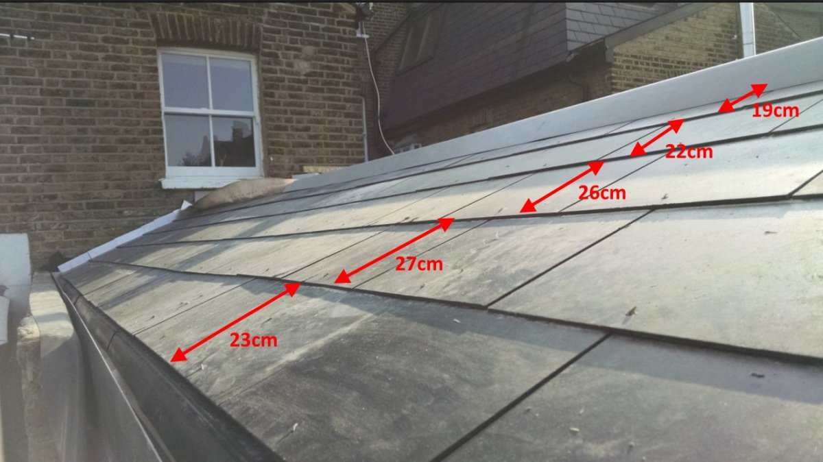 The correct gauge on those four courses would be 245mm which would give you 110mm head lap. You would always expect a few mm variation but you have up to 50mm variation there. As I said pretty shoddy for only four courses of slates.