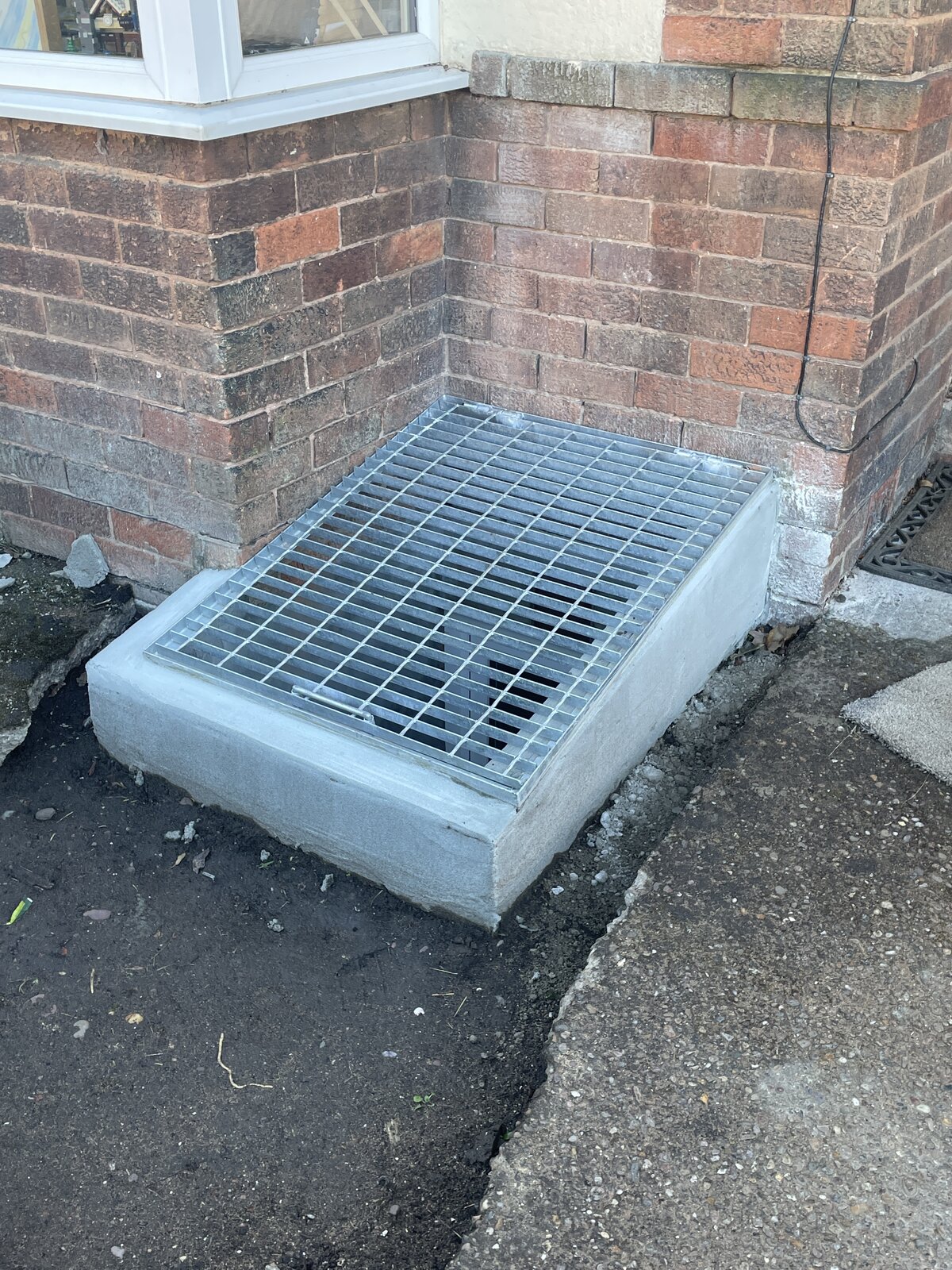 the issue is the light well- for egress the existing coal chute was used, the sides squared off and made about 6inch longer, a metal grate installed where it was previously a concrete slab, and a window below ground level where the previous coal chute entered the cellar.
