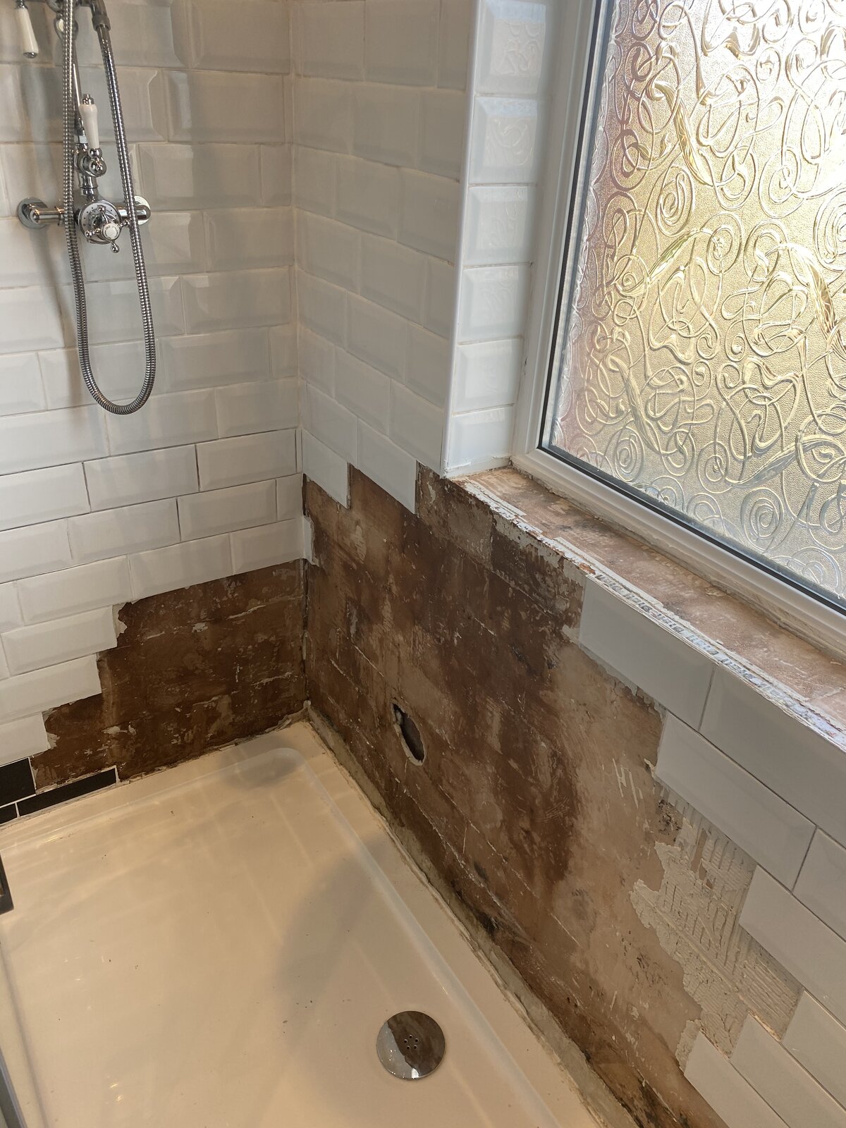 I had a few loose tiles in the shower so decided to remove them, I’ve now taken quite a lot off and all the plaster is damp and soggy.