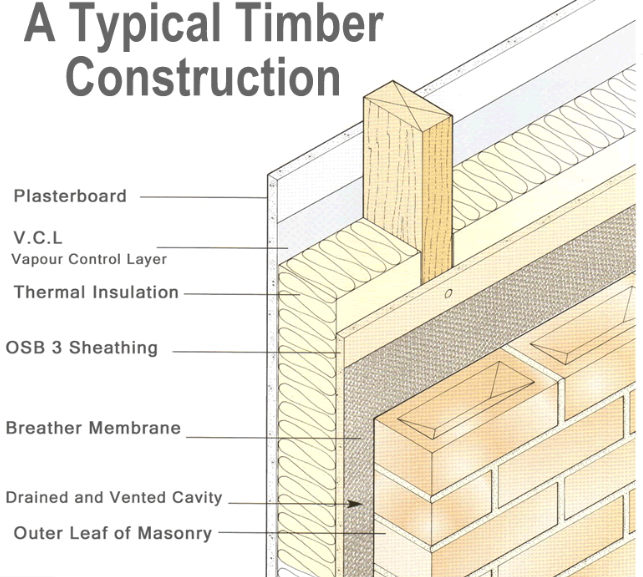 However, there are circumstances where the process can be reversed. If we have a long cold spell, the external brick skin becomes cold, and the internal face of the insulated skin is also cold. Both brick and insulation have a fairly high thermal capacity and slow thermal inertia. If the weather changes to warm and raining, the external air becomes saturated and at a higher temperature than the building fabric. because of thermal inertia it may well not warm up as rapidly as the changes in external air temperature and humidity, and hence condensation will occur. Now the ventilated cavity is introducing moisture during the period when these circumstances occur. It is this condensation that the breathable membrane counteracts by protecting the timber frame.