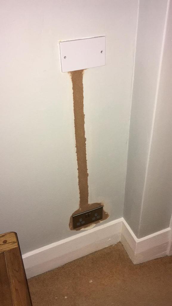 I’ve been volunteered to assist the in-laws with covering up a chase following them having an electrical socket moved about 2 ft down the wall, so it’s not the largest of areas. From the pictures, it looks like the electrician filled the chase with hardwall or bonding when he did it a couple of weeks ago, but just put a face plate over the old socket. I need to fill this void from the old socket and then plaster to a finish over this whole section, hopefully without having to plaster the whole wall.