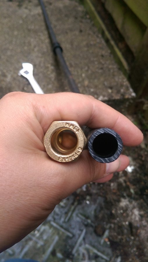 We've got this black plastic pipe running round to the back garden from a very old stopcock. I want to connect to an outside tap. As you can see it is bigger than 15mm but smaller than 20mm. Is it an old imperial pipe and is there any way to convert it to 20mm or 25mm mdpe?