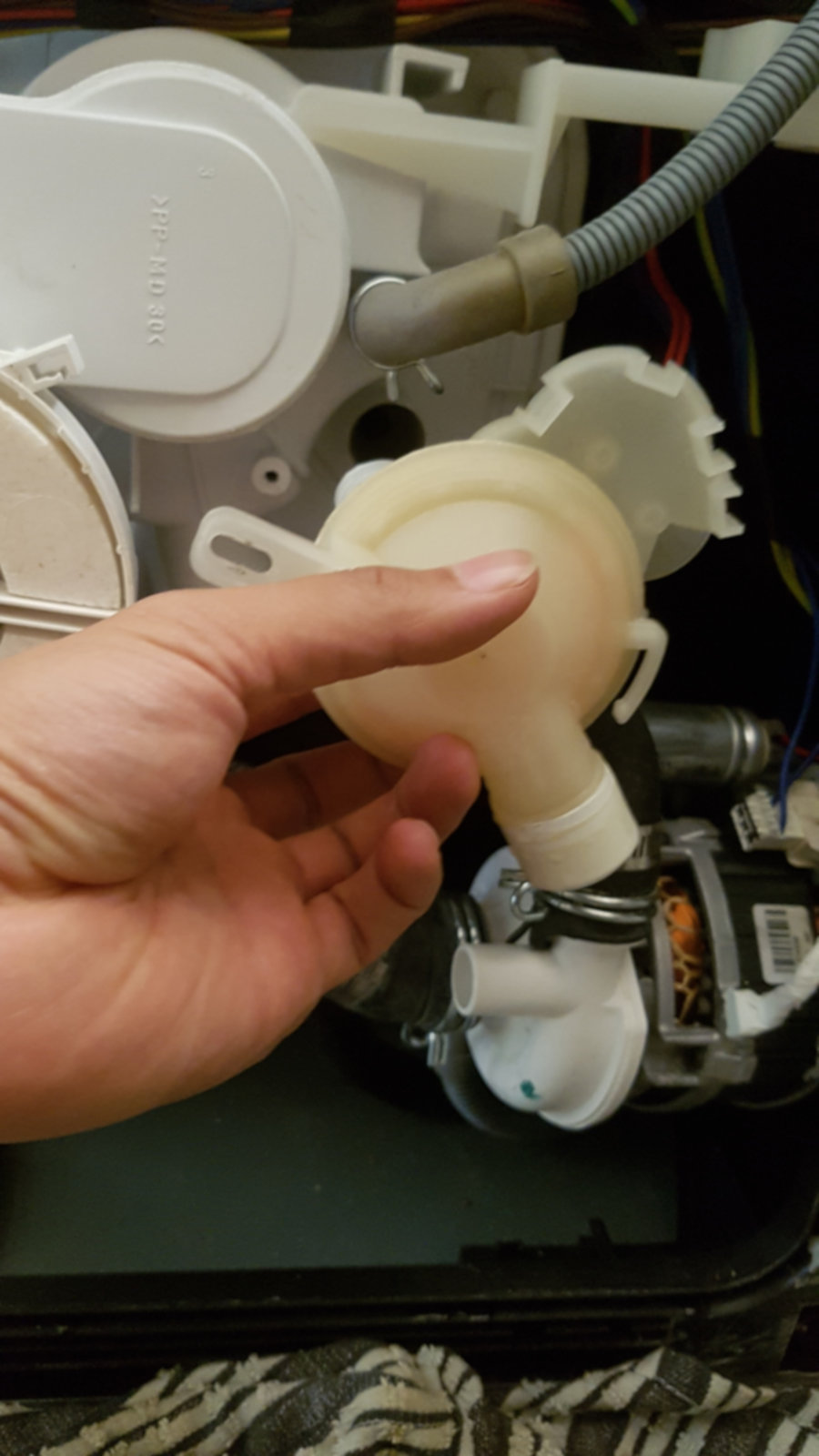 During cycles, the part in the attached pic appeared to be leaking pretty severely and setting off aquastop. So I turned the machine over, took it out from its place underneath the sump, unclipped the small motor-looking assembly attached to it, taped the hose ends and filled it with water to see if the housing had been compromised. It definitely does not appear to be watertight in its current state.