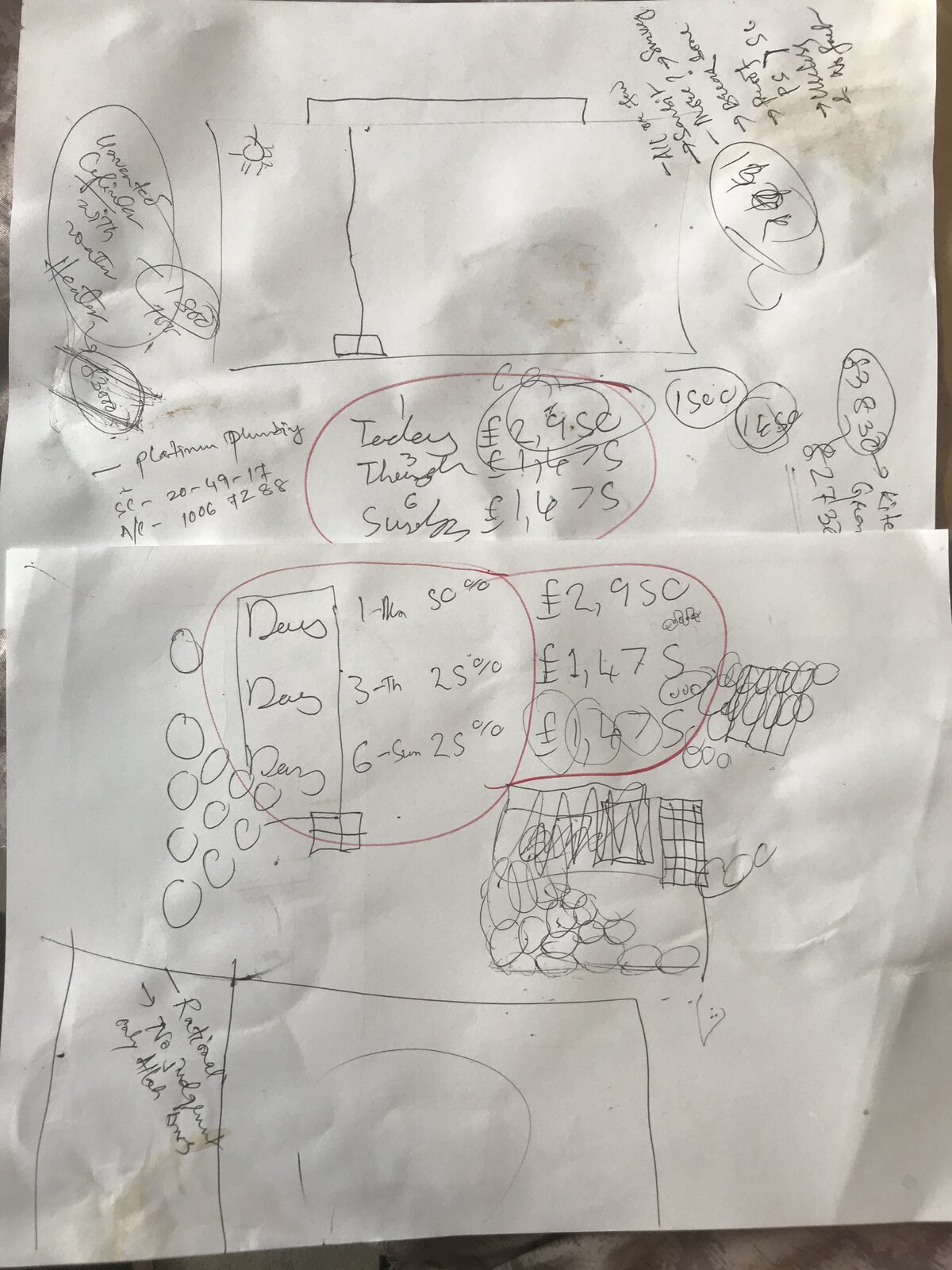 2) 13/07: At my house, Sketch was made on this day, showing payment plan for £5900, demanded 50%. I transferred £1500 and promised rest of 50% next day.