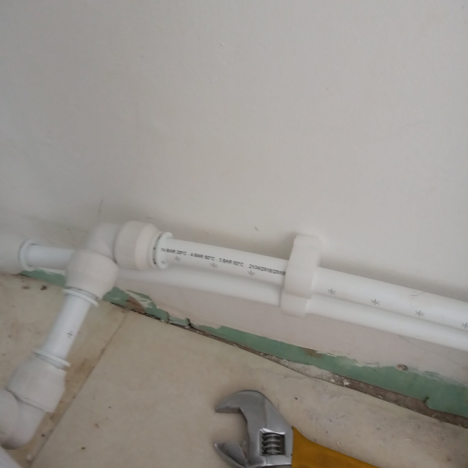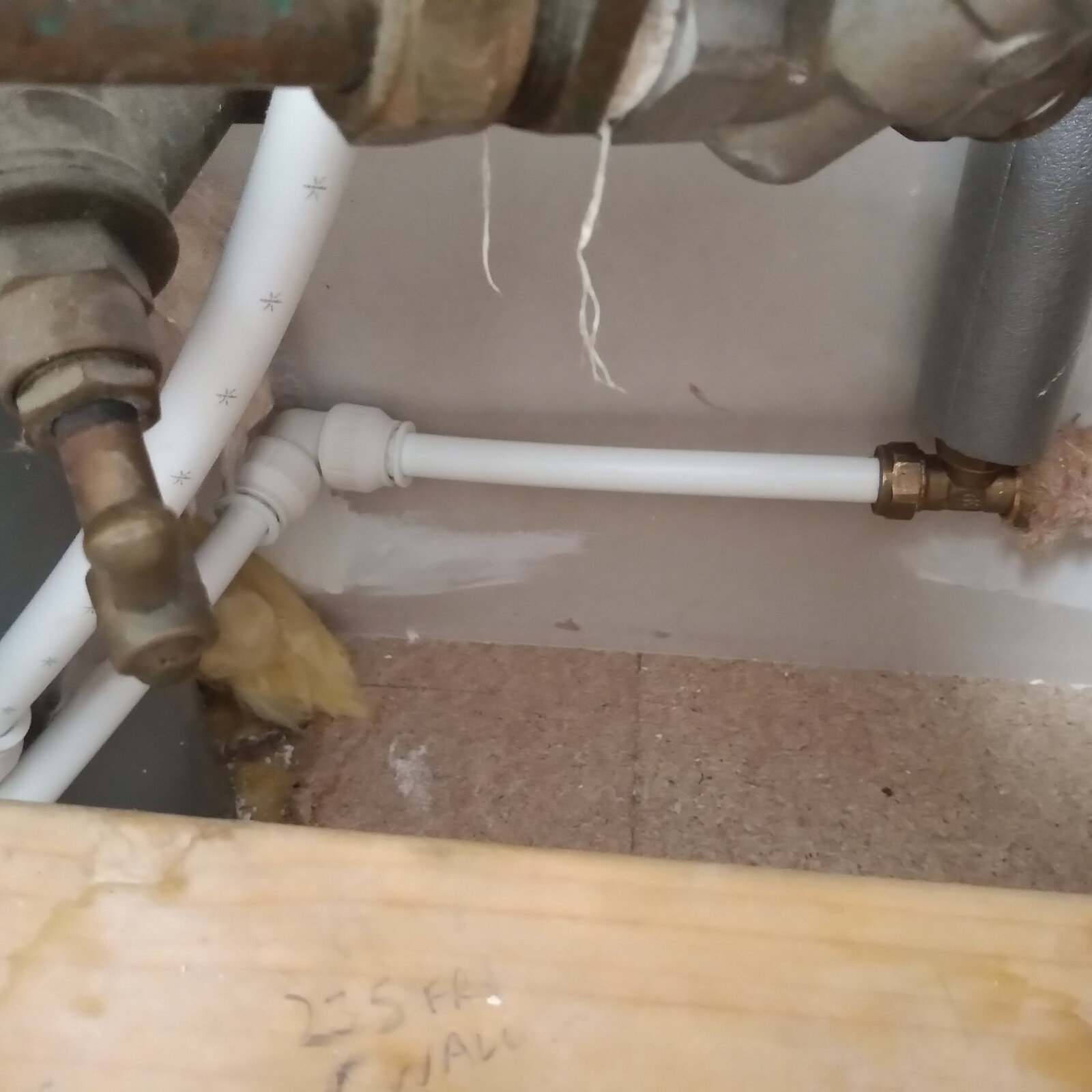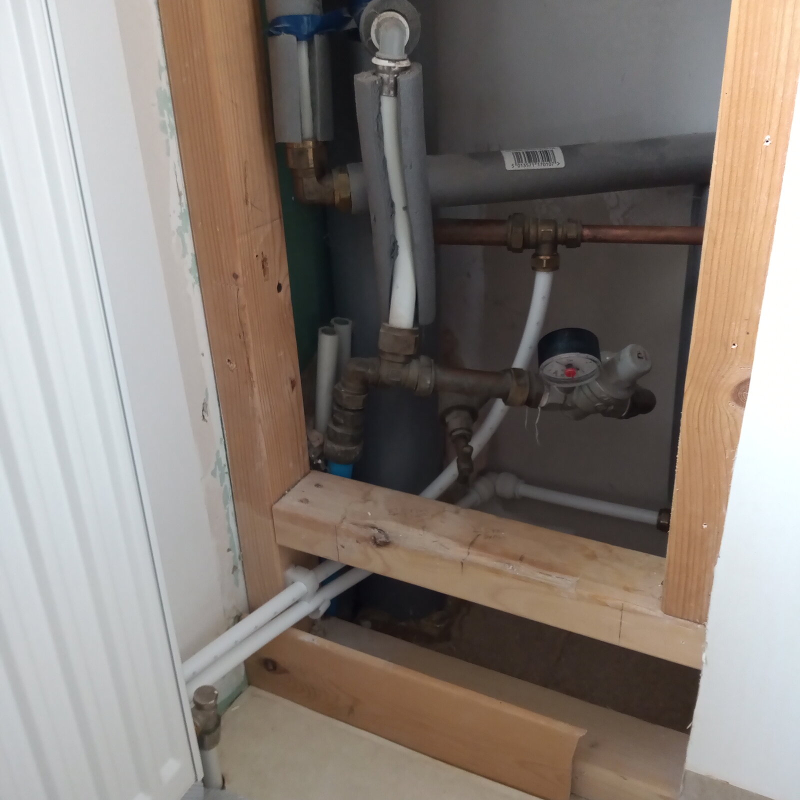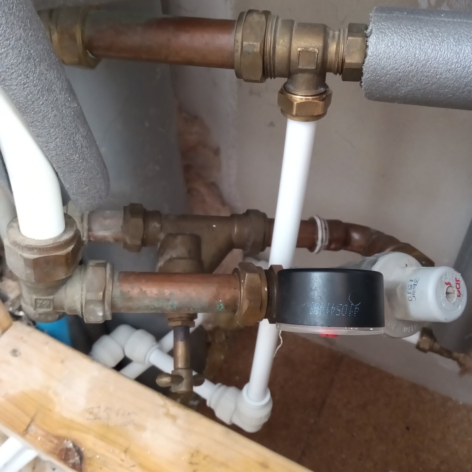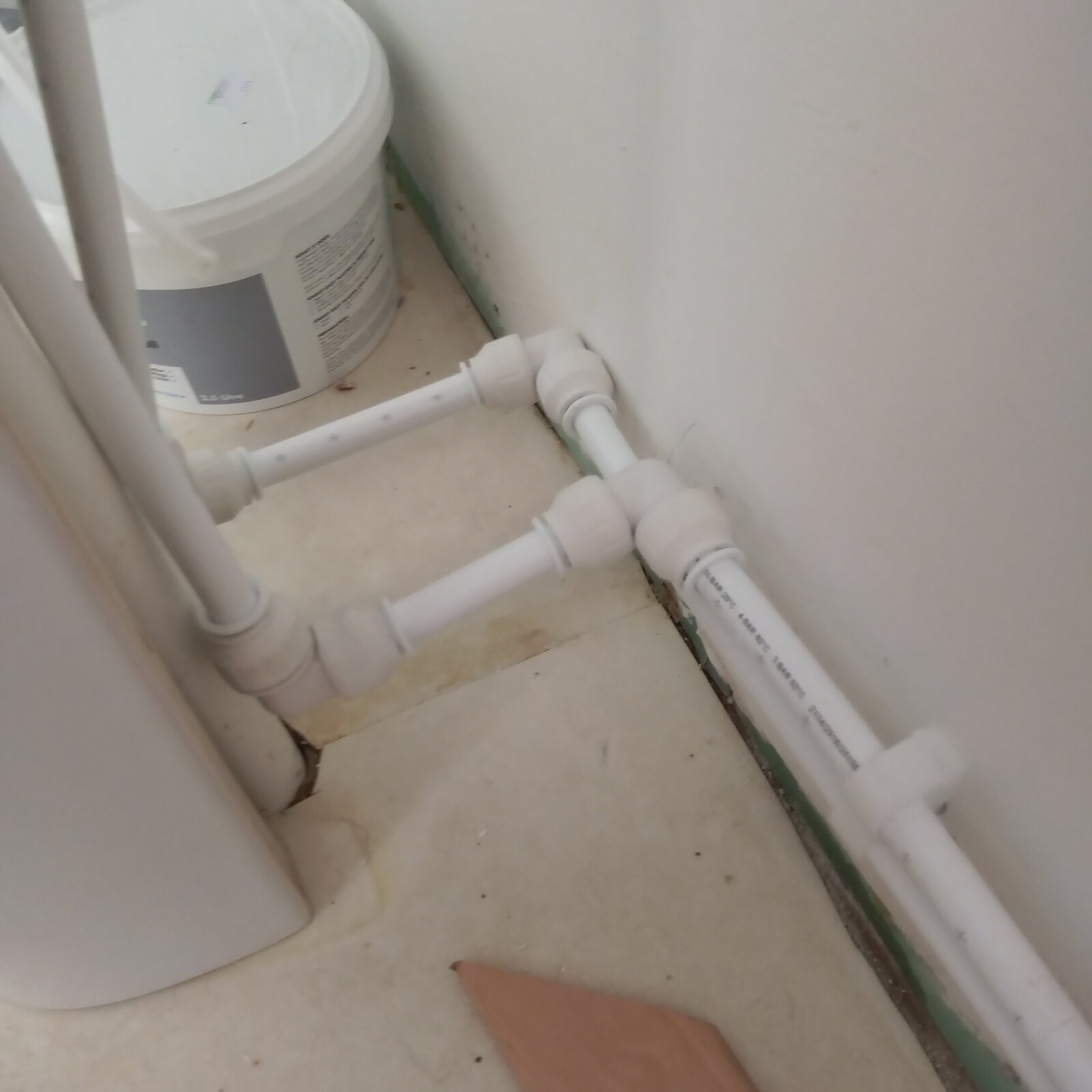 So.... Yesterday I redid all the he plumbing in the shower room with a mix of JG and traditional compression fittings.... On gently repressurising the system there were evident very minor leaks, all where the 2 differing systems met. HW to JG all good nice clean straight exit. But CW not so good. As you can see in the photos there's some hideous pipe bending going on despite using some bends. The house is in Scotland in Highlands and we had to rejig the supply it used to be neatly in the floor cavity, it's a glorified shed on 200mm stilts that brilliantly allows -20c air to funnel through the floor and freezing all the pipes so had to be brought into the living space above FFL. The other minor leaks are at the isolator to the outside tap but I can rejig that with a JG isolator I have ( and wish now I'd used) one tap tail is slightly leaking but with slow and steady intervals I have got that to negligible.... So, can anyone advise what to do, should I disconnect, fit new olives and/or PTFE and jointing paste. I've a feeling many of the issues are due to the angles involved. The lad that originally rejigged it all agreed it was a nightmare lol. Now I've got to get creative around the replasterboarding too... Oh and btw is there any way of removing the writing from JG pipes... Let my guard down and one is visible...missus not too chuffed lol