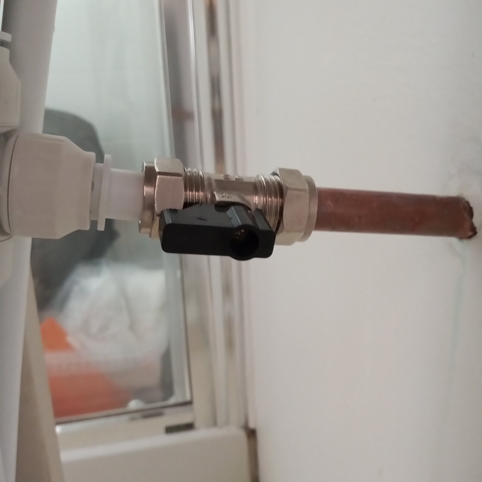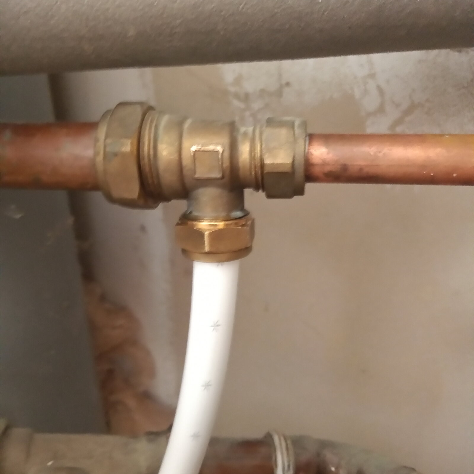 Well, decided to modify a few bits... Separated the cold from the right angle and added another piece to get the exit from the 22/15/15 a lot squarer. Thing is I redid the compression fitting with just 2/3 a turn and had to nip it up and eventually I realised it was not happening.... Aaaargh! So simply took it apart, 6-8 wraps of PTFE nipped it up and finally it's dry. As for the isolator to the outside tap I banged on with the PTFE and it's now sorted, also sorted out a less than ideal right angled bend ehind the pedestal. The HW tap tail has stopped weeping so all good....unless someone tells me PTFE will eat through speedfit pipes lol....then it will be me weeping ha ha