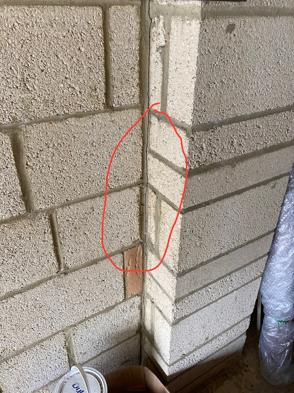 My house is a detached built in the 90s with an integrated garage. I just found in the garage there is a vertical crack (from ceiling to the floor) in the pointing where the wall meets a column. It is circled in the photo. It's about 1mm in width in most places. It may be there for a long time. The other photo is from outside where I circled the approximate area.