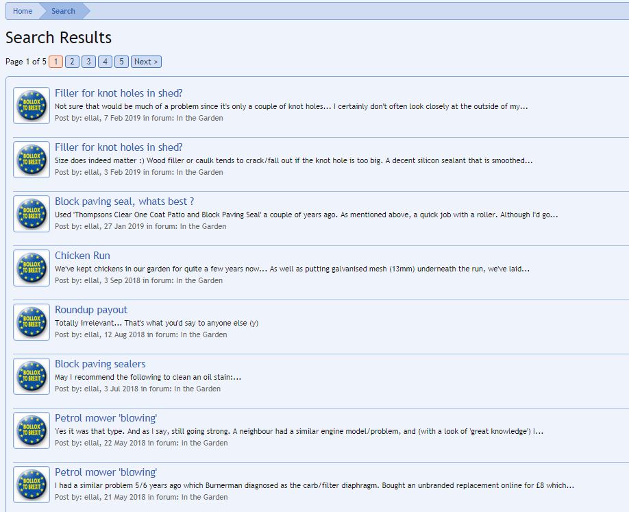 If you go to the search page, put ellal into the members name field and hit search you get 10 pages of threads ellal has posted in.