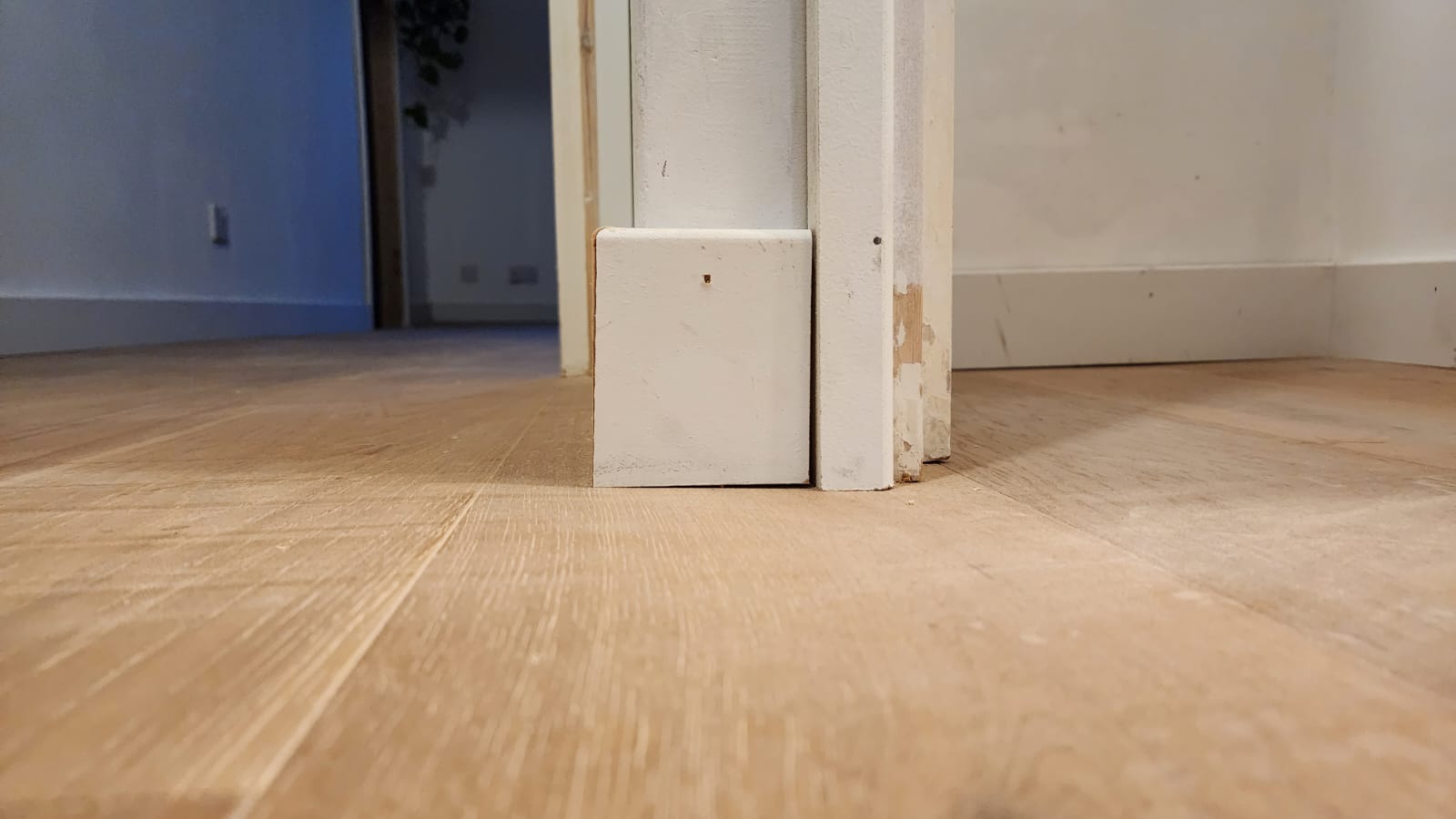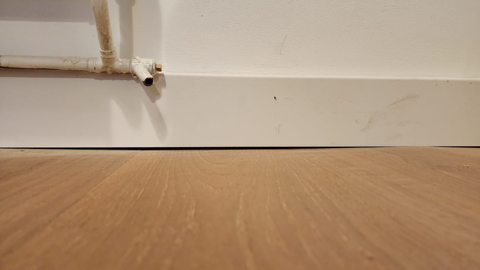The flooring company said we need to get a decorator in to finish it off - but there are parts where the adjacent skirting boards are not level at all; areas where the skirting sticks out from the wall by about 2cm, huge gaps along the floor, and parts where the wood has been forced in so has split. They have also been installed inconsistently, with some corners being cut at angles and others running straight into each other.