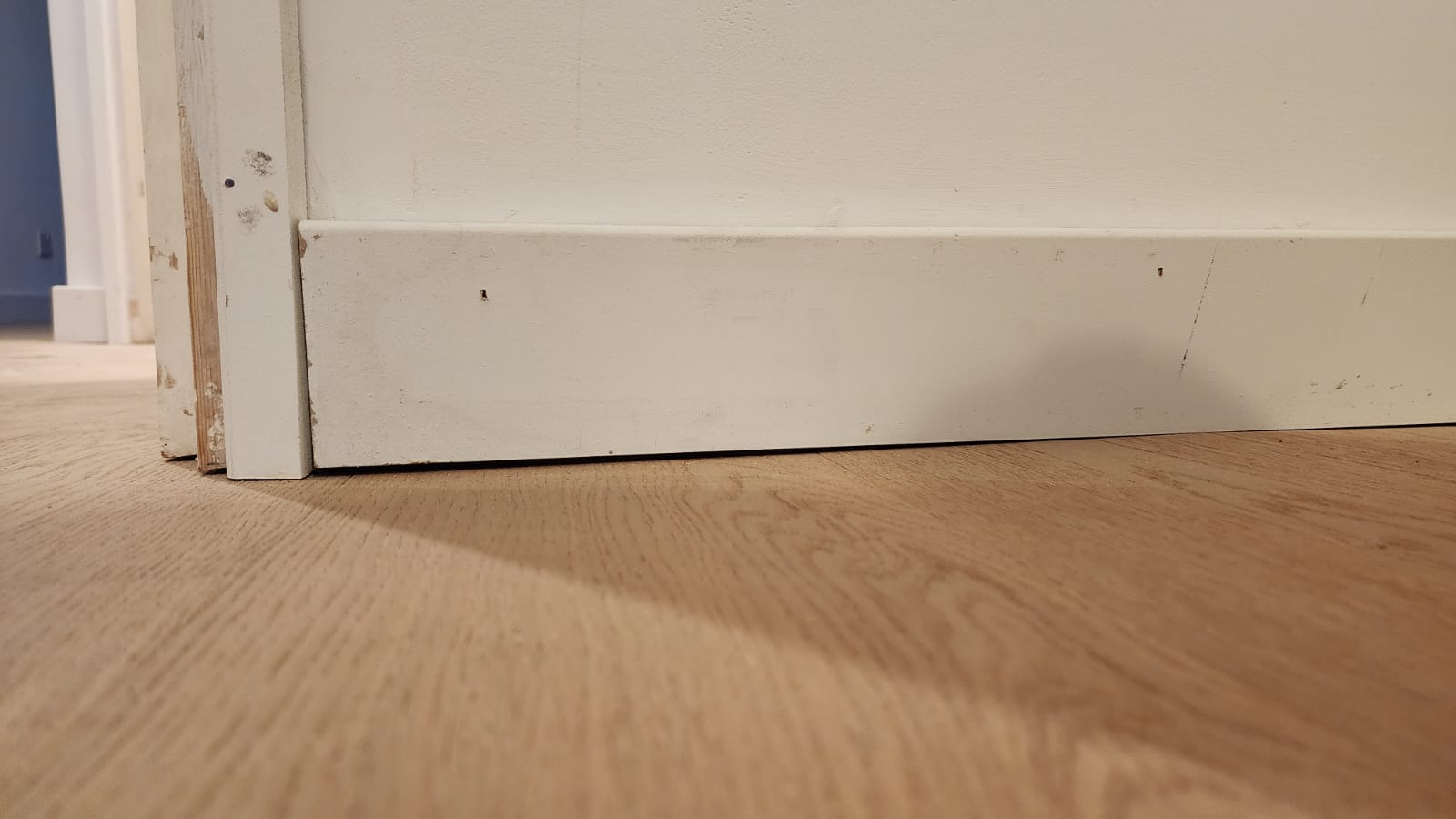 We recently had our entire 1 bed flat re-floored with engineered wood. Part of the quote included the installation of skirting boards, with the caveat that this would not include decorating & finishing. However, we are appalled with the final results. We have been doing most of the reno work ourselves (including full bathroom refitting) so we are pretty handy, but we feel given the price we've paid for this particular project, this is not up to standard.