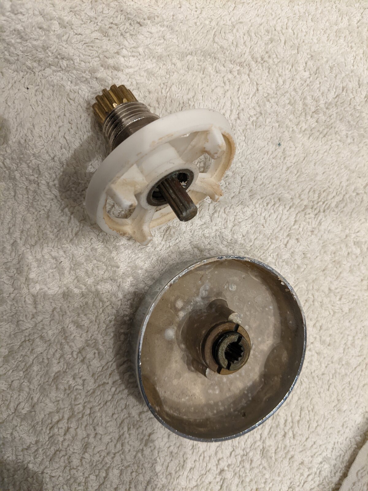 I have just had to deal with one of these. The chrome knob came off relatively easily with a screwdriver each side levering against the white section behind it - not the bath!