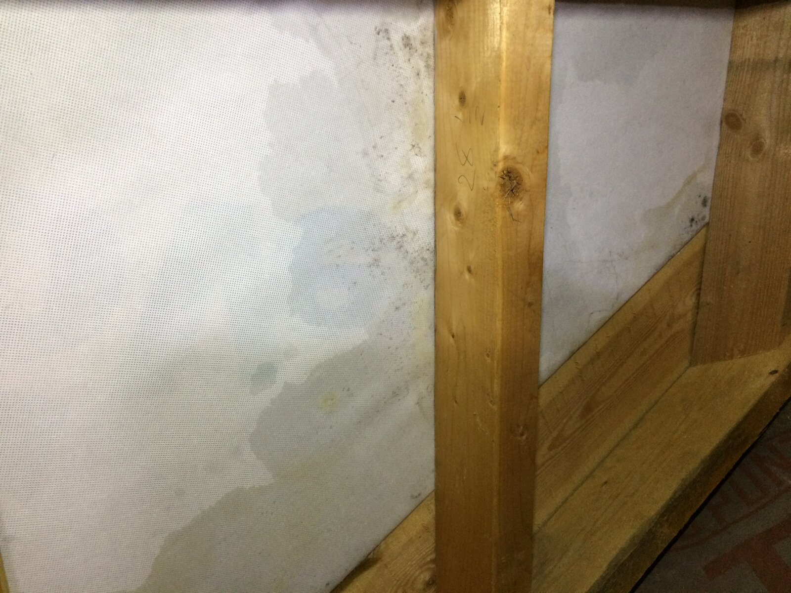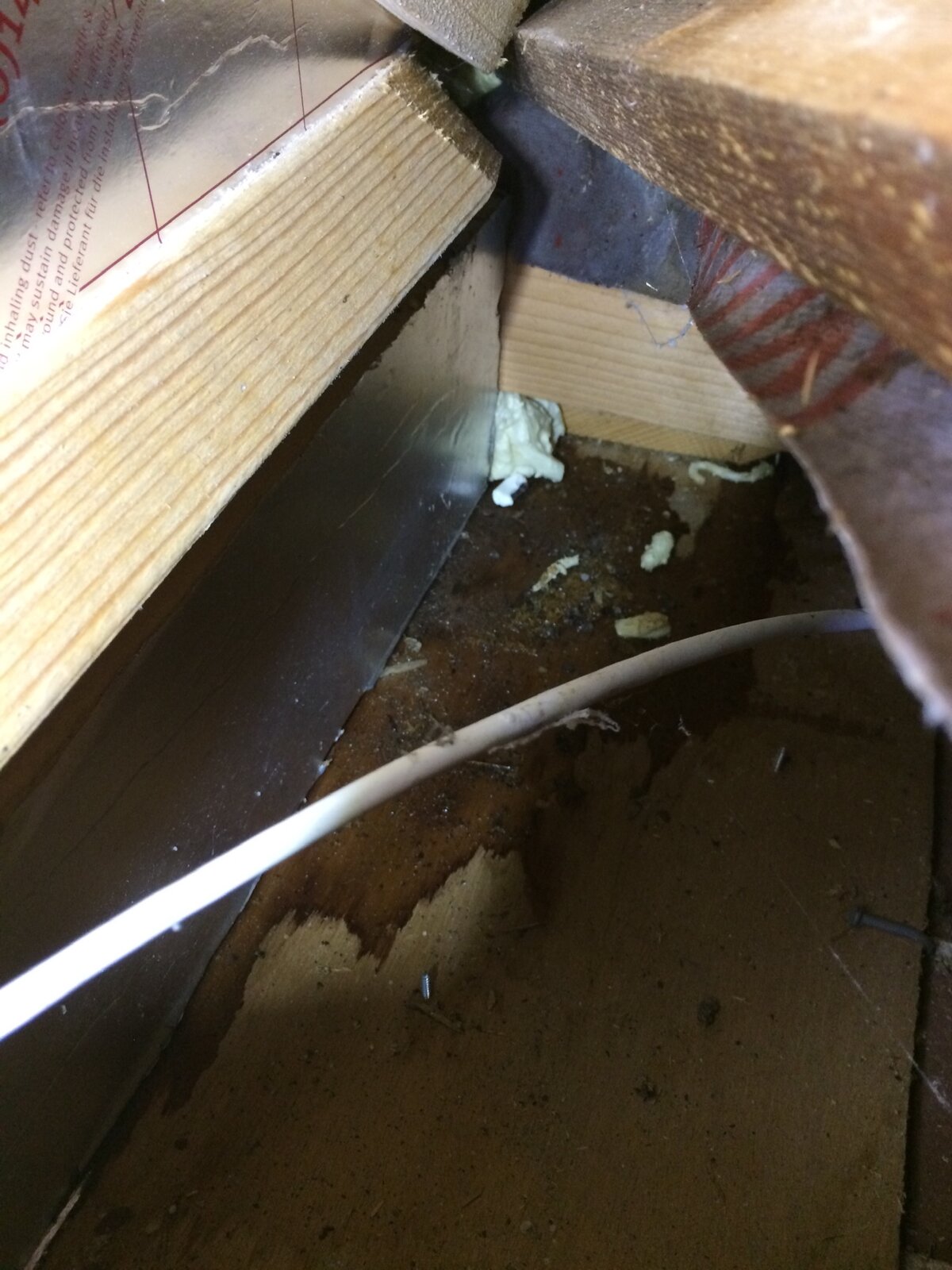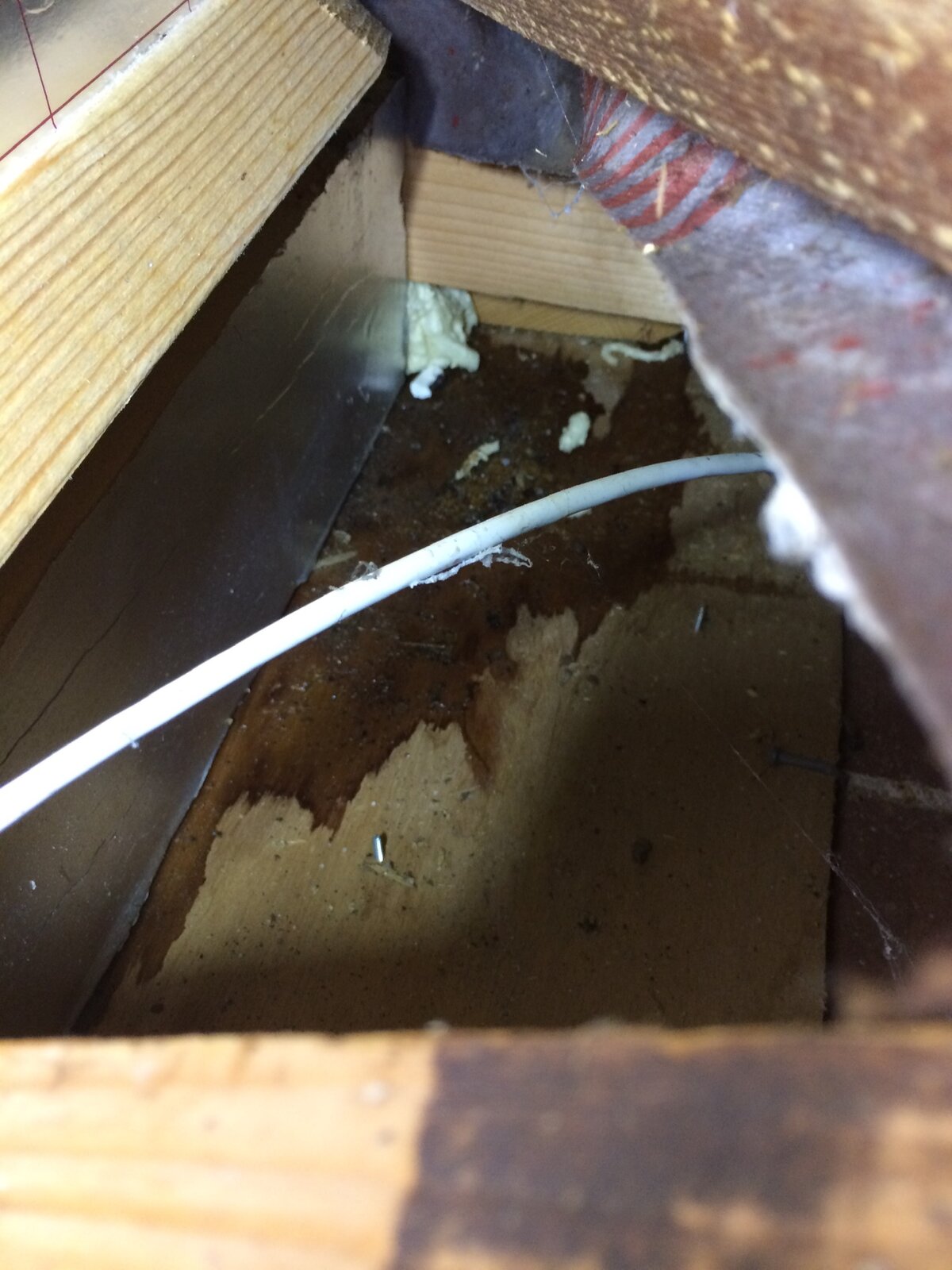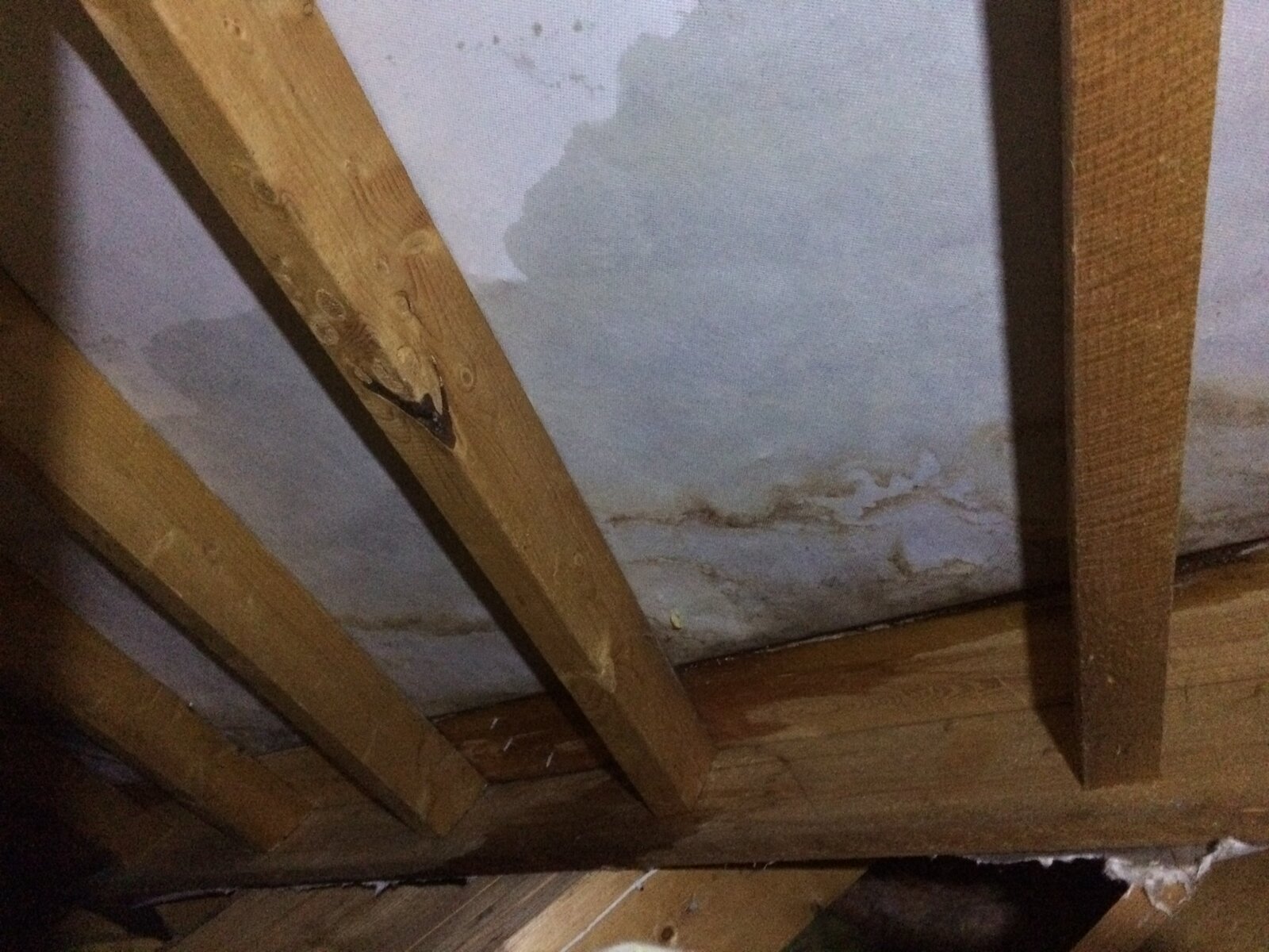 After the heavy rain we’ve had these past few weeks the leak stain reappeared on the porch ceiling and started spreading. I looked up in the loft again and could see what appeared to be three leak sites