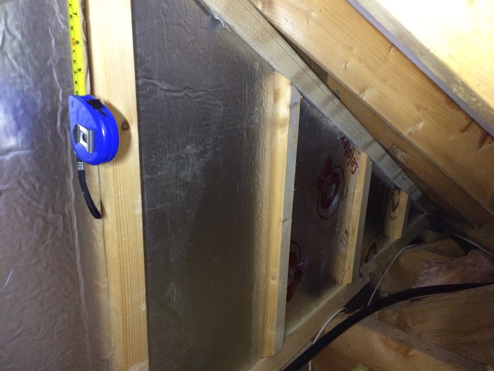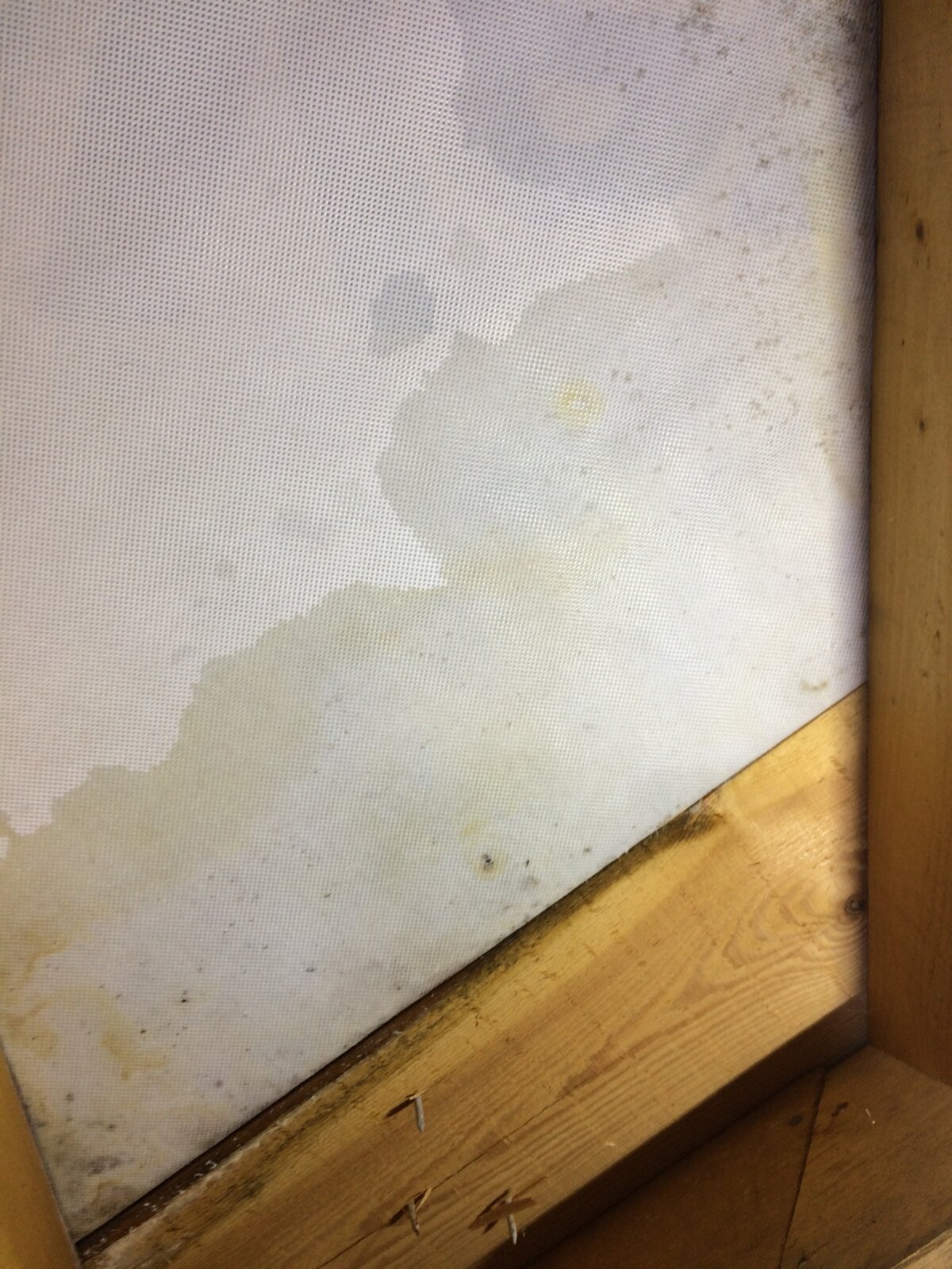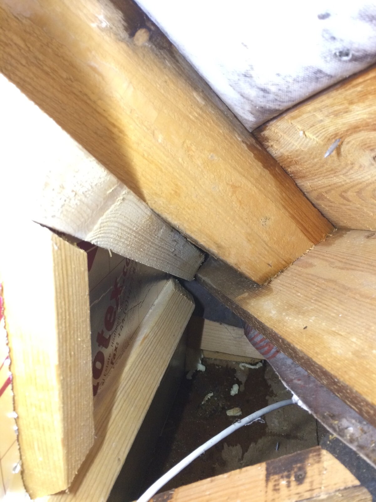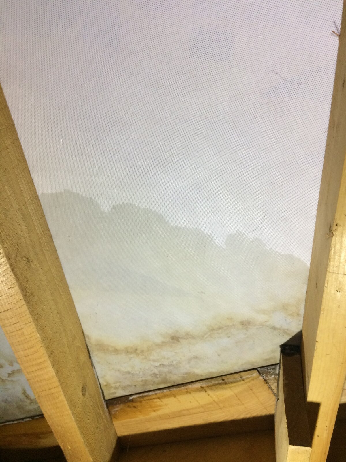 After the heavy rain we’ve had these past few weeks the leak stain reappeared on the porch ceiling and started spreading. I looked up in the loft again and could see what appeared to be three leak sites