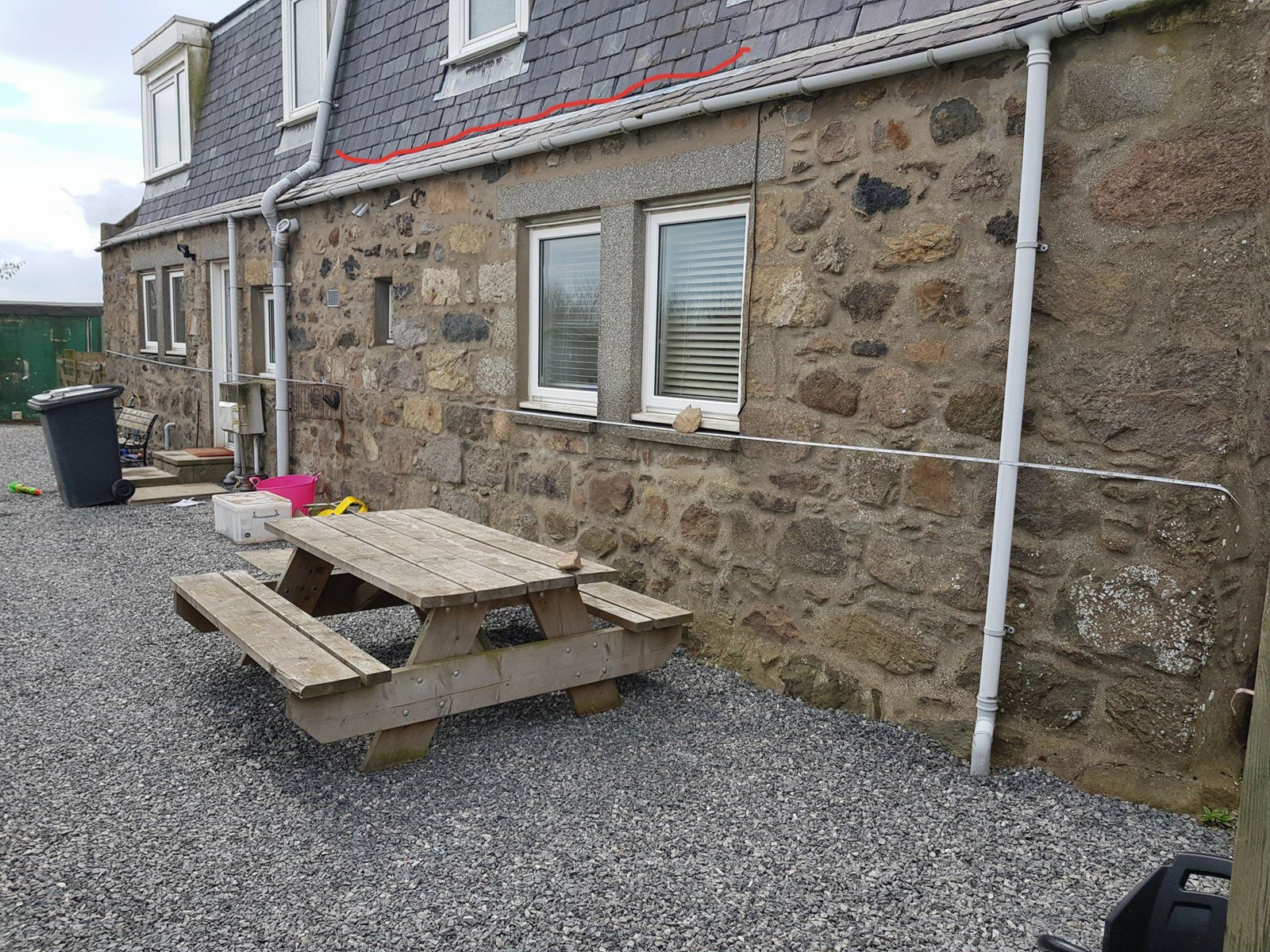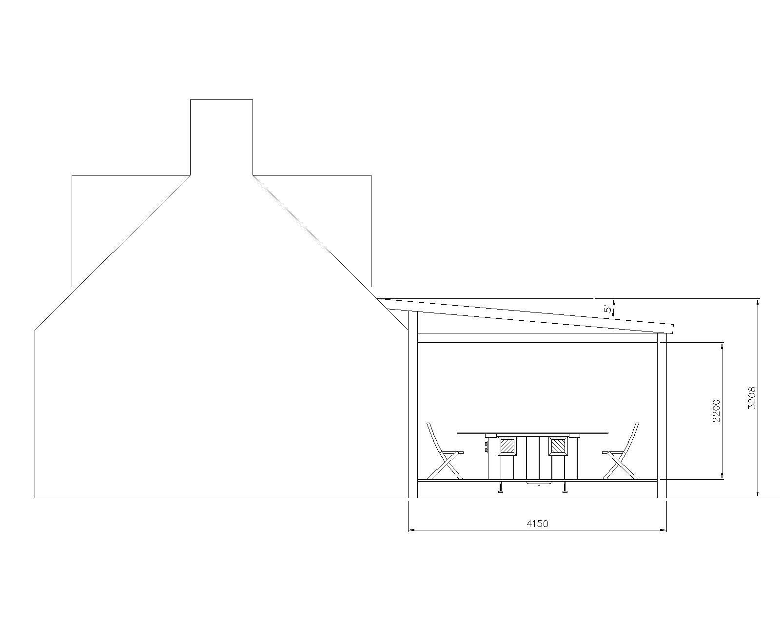 Hi all, I'm designing a porch/decking area along the rear of my house and I'm struggling to work out how to put a roof on it. I'm only at early design stages at the moment but I've included a rough plan and end elevation. The problem is I want to put a roof over the large decked area which will be over 7 metres long and 4 metres deep from the house wall. The house was originally single story but someone built a dormer extension with flat roof many years ago. The gutter height at the bottom of the sloping roof is 2.7m and I think I'd need to build a shed style roof that goes back to the house roof but does not touch it. But working it out in Autocad it seems I'd only have a 5 degree pitch. Would this be a major issue since I don't need the roof to be water tight only secure and strong enough to handle the wind. I live in Northern Scotland so I want to roof my decking area and fit curtains around the edges so that I can enclose it in the evenings when the fire is on. I plan to build a brick fire place with chimney higher than the porch roof. And suggestions would be appreciated.