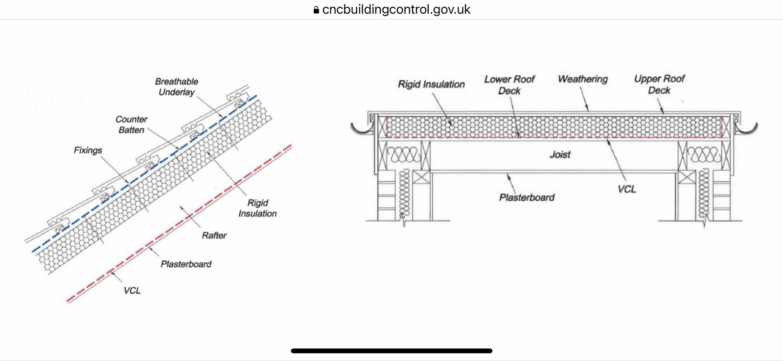 A pitched warm roof is basically the same as a pitched flat roof . Not ventilated . Vcl warm side of insulation