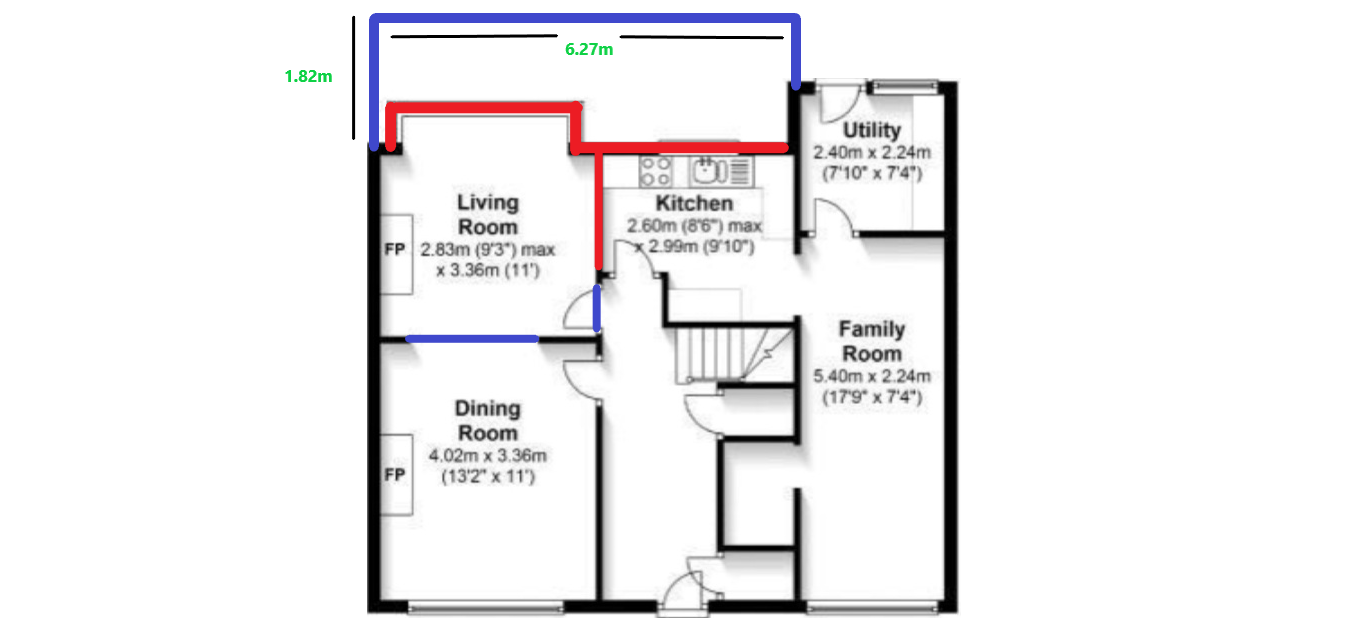 The extension will be 1.82m deep, exterior wall to exterior wall and 6.27m wide, 2 story. So 11.41m2 in total. There is already an old small extension on the back of the dining room I will want removing and renewing. Also some interior walls will have to knocked down and one rebuilding in the process.