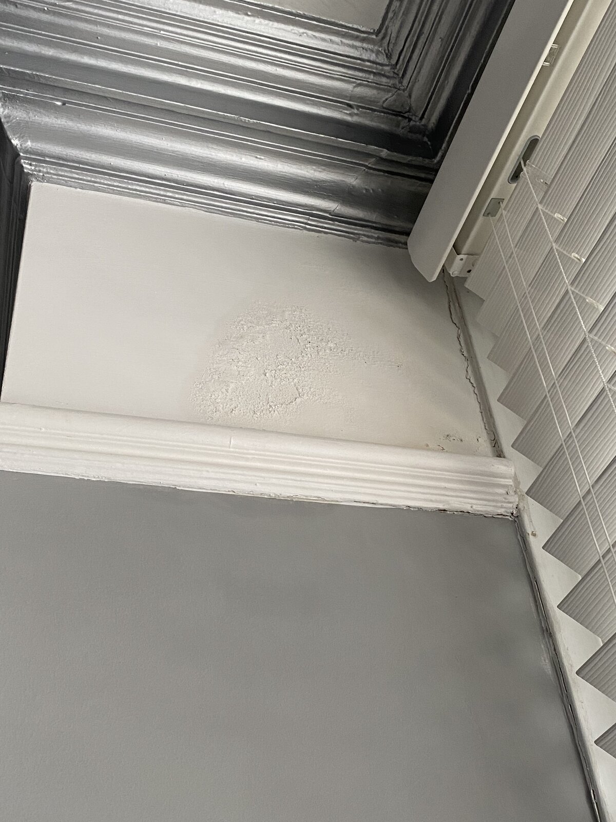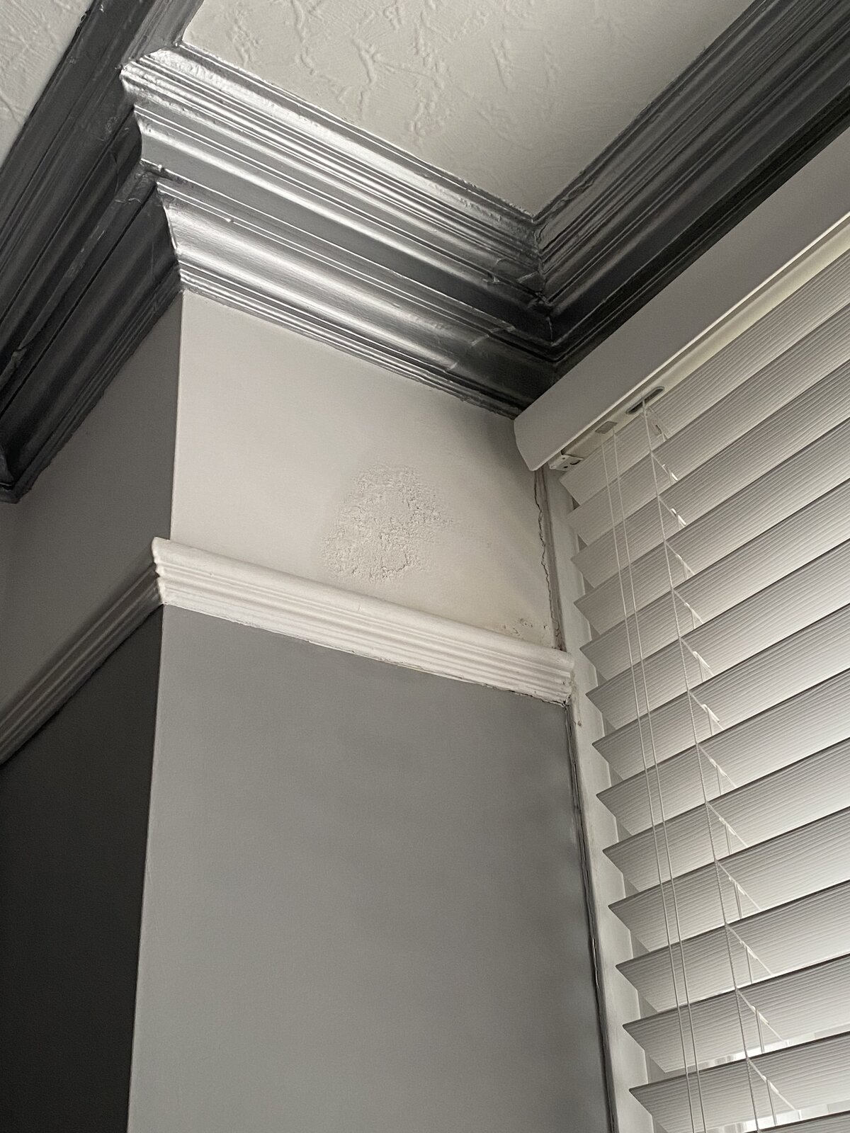 If so suggest you have a good look at the flat roof and any parapets on the bay window, on the inside especially, you are looking for old [possibly] damaged lead or felt roof covering, also have a good look at the junction of roof covering and parapet.