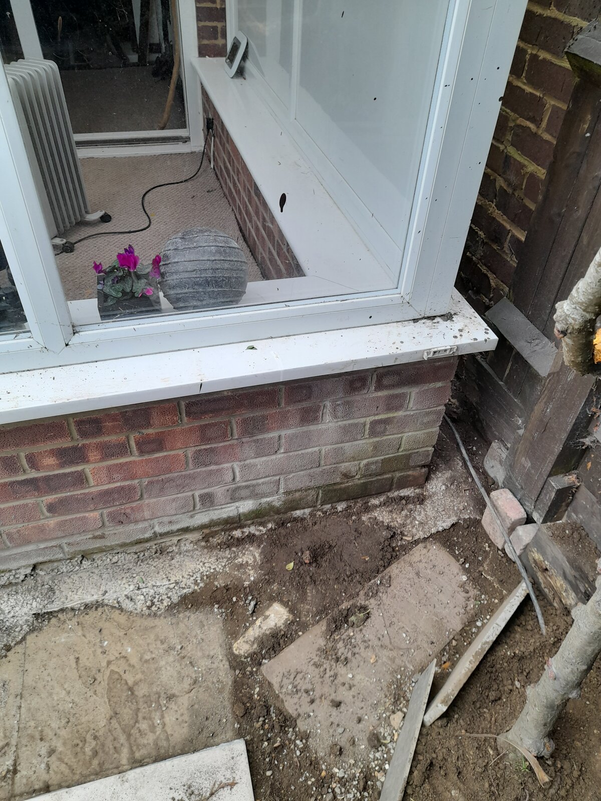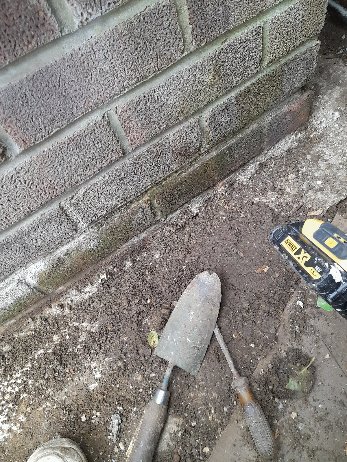 It appears a possible DIY underpin has been attempted using sh1t concrete and possibly a built In row of slabs to add support ( Backfalling though!). The slabs were doubled up and only course away from dpc, and after removal it's clear the foundations to this shoddy 1980s conservatory are poor.