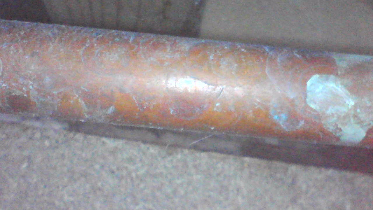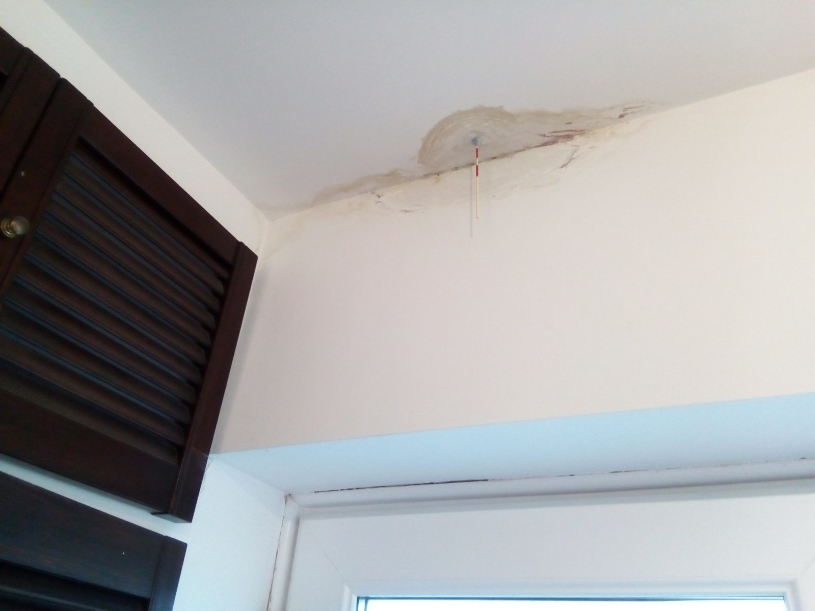 We have a small damp area in the ceiling above our side door which has been there for a few years but as it hasn't expanded or gotten worse I only started looking at it recently. I drilled a hole up through the middle of the damp area and put a striped stick through (see first photo). By using an endoscope and poking behind the skirting in the bathroom above, it seems that the damp area is directly below the right-most column of tiling in the shower (see red arrow in second photo). There is also the water supply to the toilet passing through which had some drip marks on it - the third photo is from the endoscope looking up into the void (i.e. where the striped stick is in first photo).
