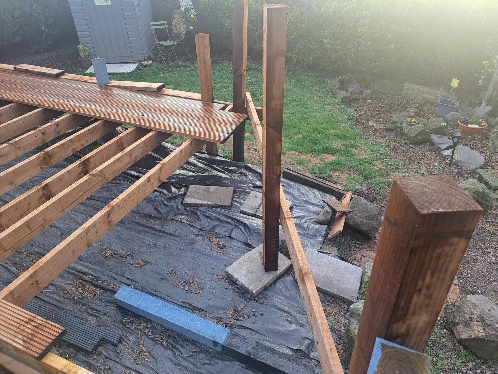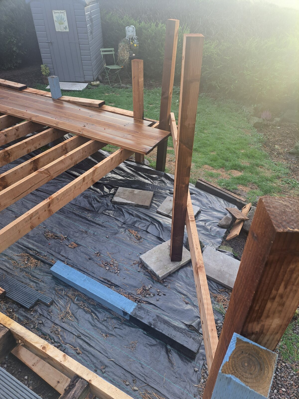 You have the long area, and then the return. Run a spare bit of timber along the angled return posts, mark it off (at the return to the longer length) and use a cheap school kid's protractor to work out the angle. If your other half is uncomfortable with you abducting a school kid and their 50p tool, draw a picture with the dimensions, and if you want, one of use will (hopefully) help you. Try to be as precise as possible and include the width of the posts.