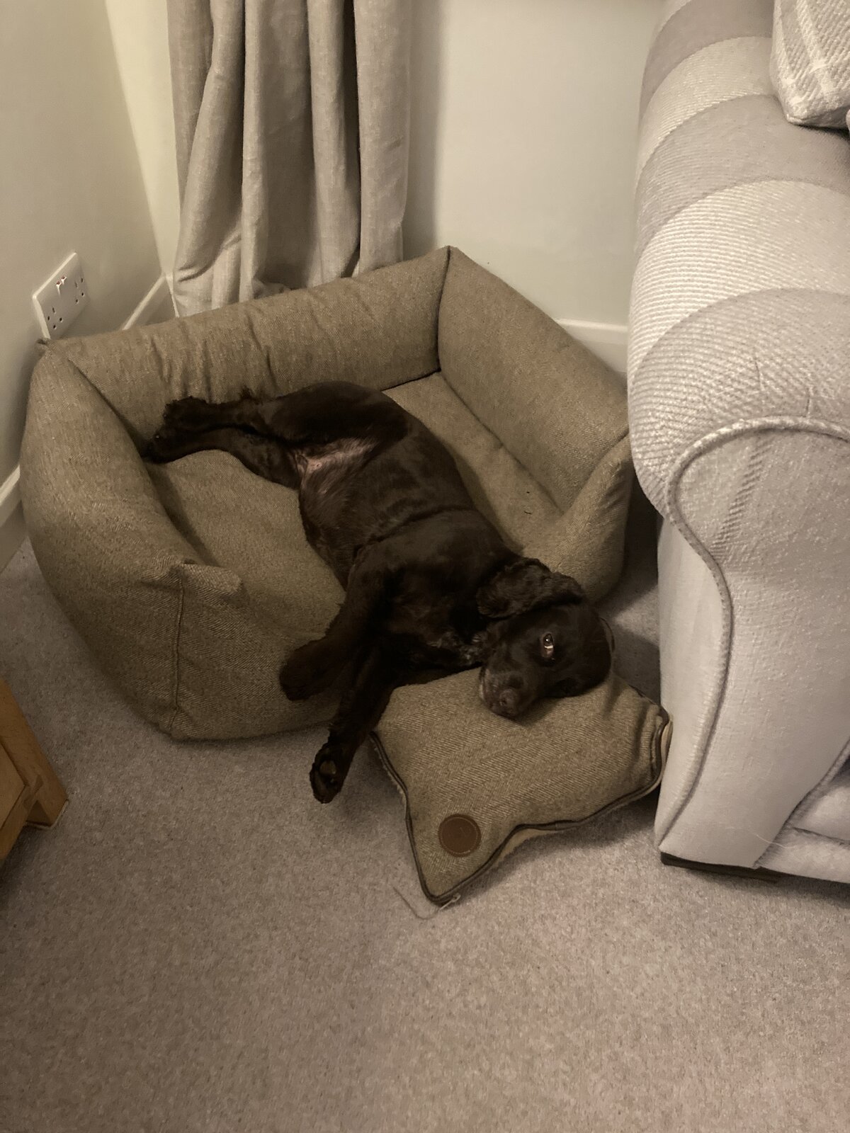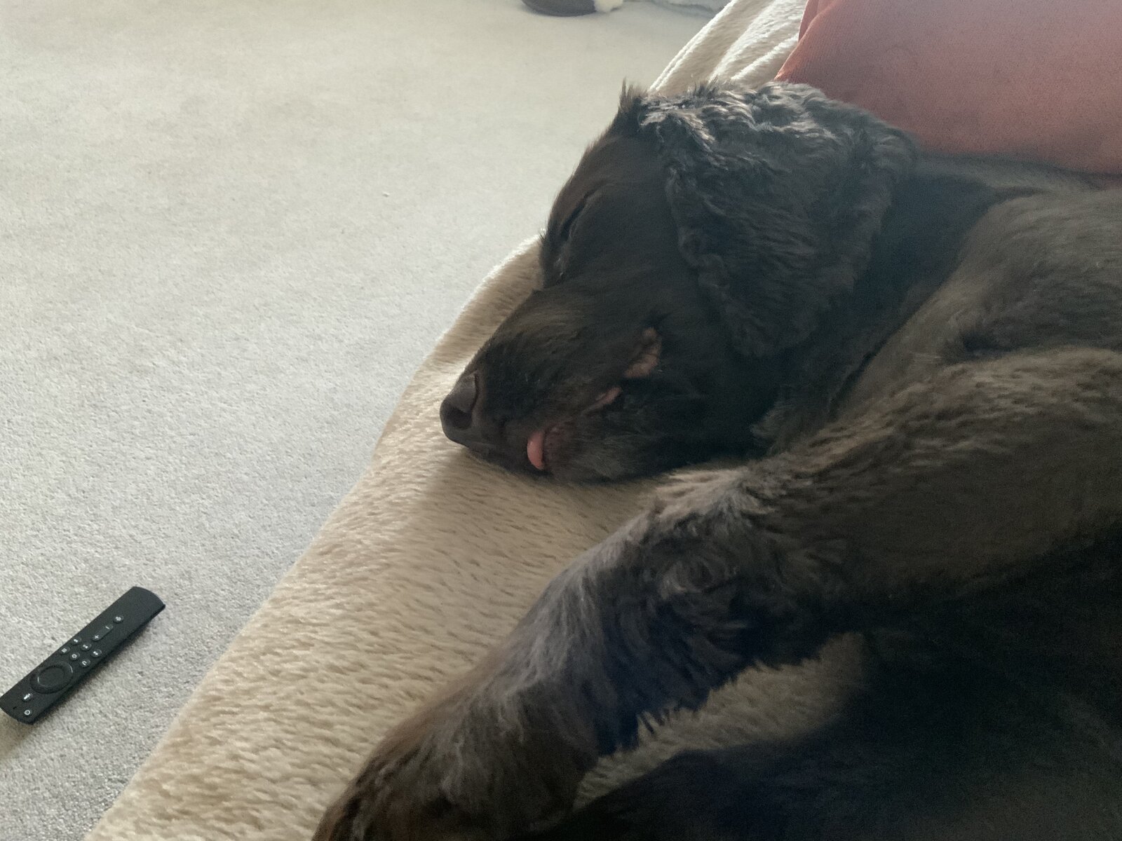 My dog, sleeping next to me on the sofa. Sometimes she still thinks she’s a puppy and suckles, hence the tongue hanging out!