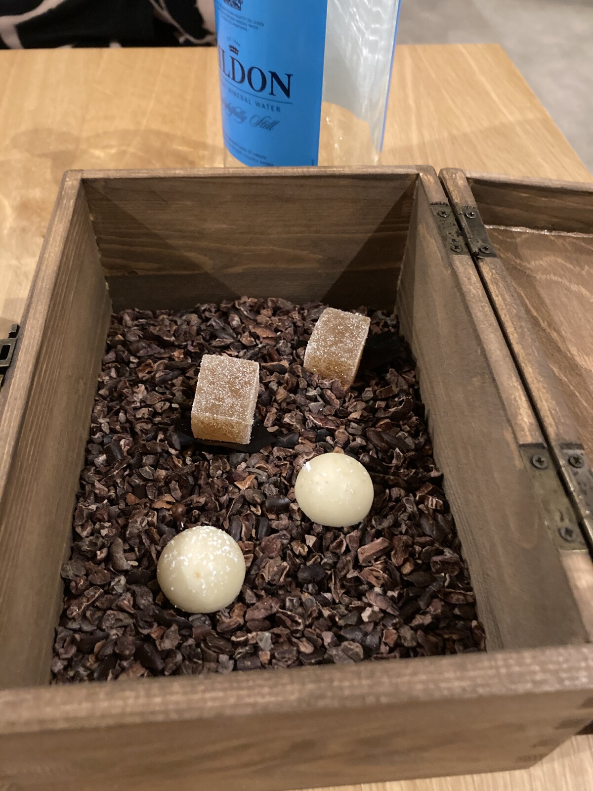 Seems overly pretentious. I can't stand the type of place that thinks serving food on old bits of trash reclaimed from a demolished building is stylish.Petit fours served after our meal last night - served in a box of wood chippings!