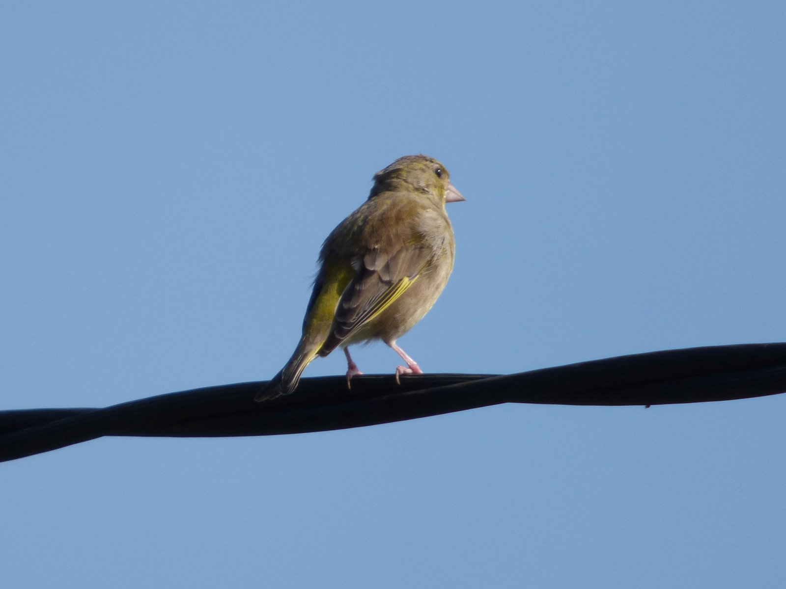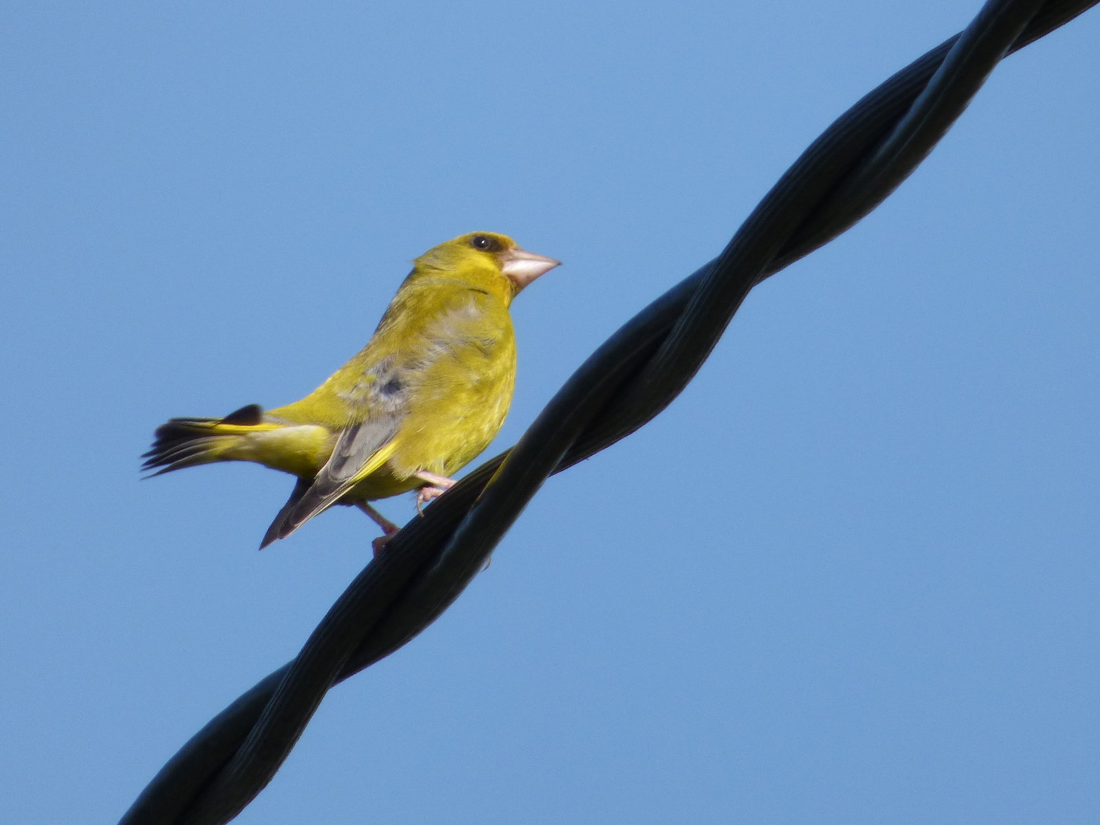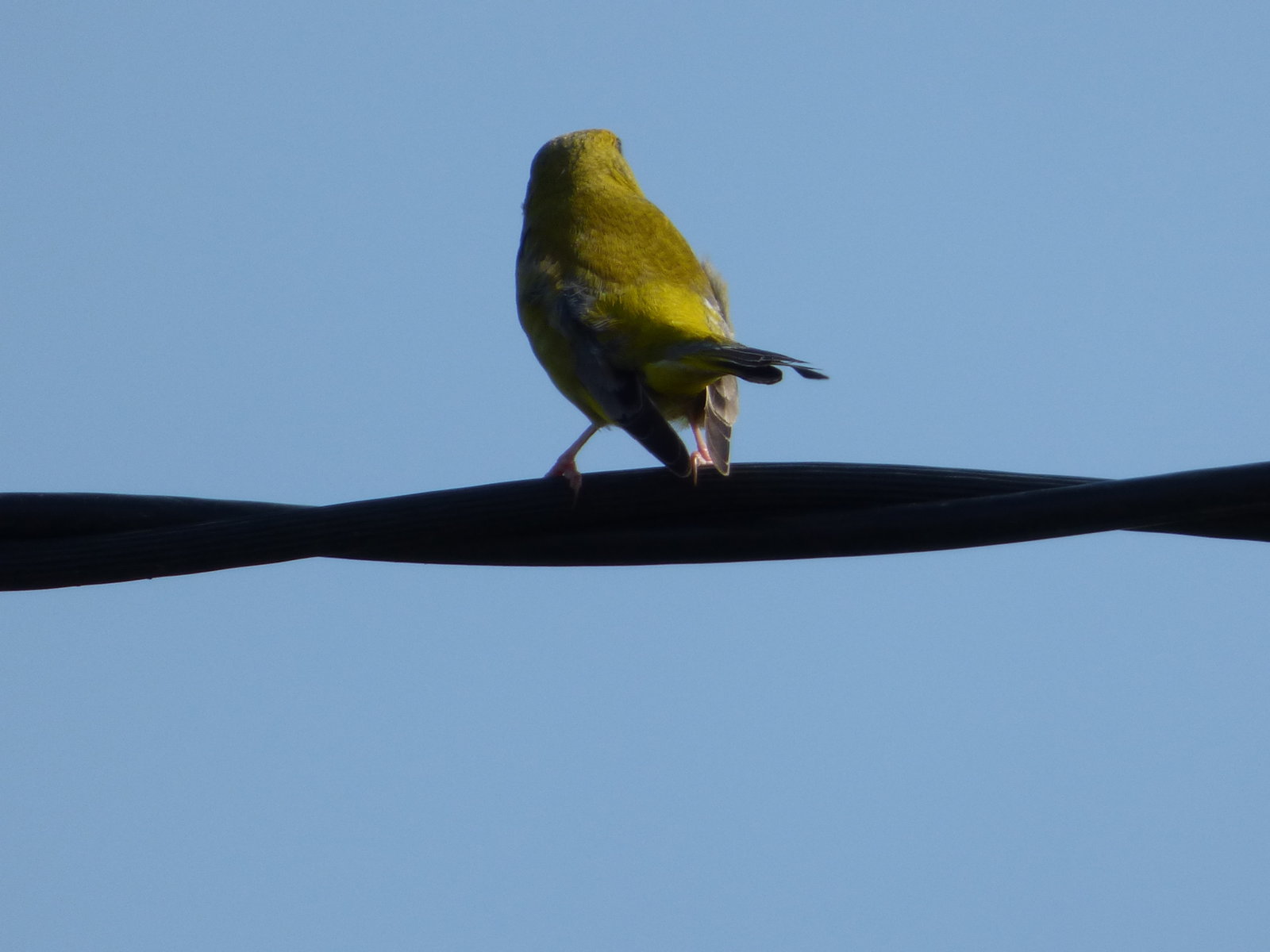 A couple of Greenfinch perching on an electric cable at the bottom of our garden this morning.