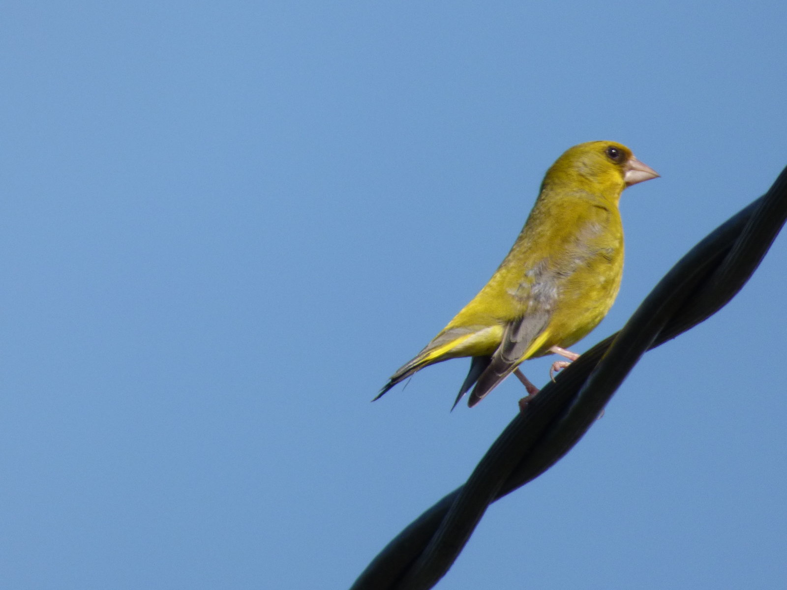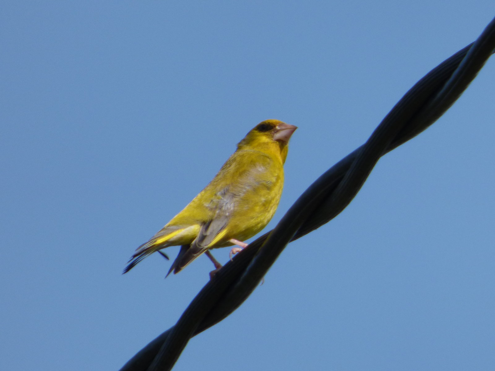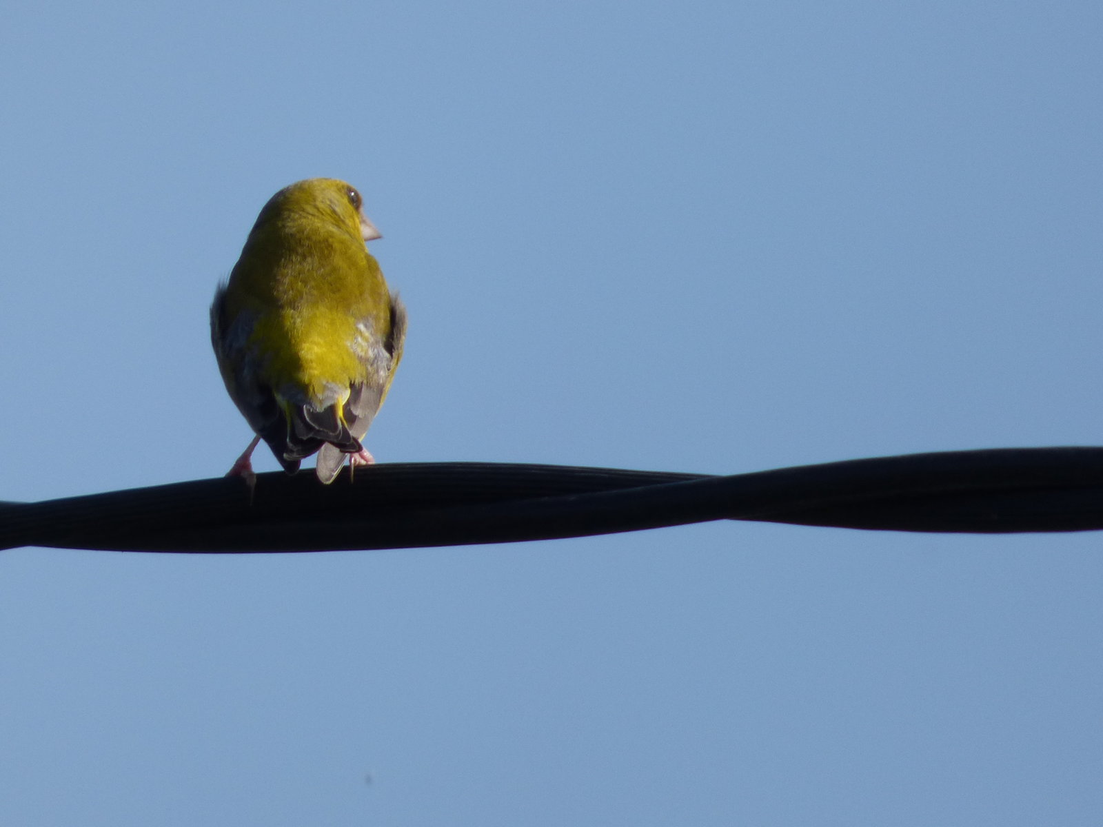 A couple of Greenfinch perching on an electric cable at the bottom of our garden this morning.