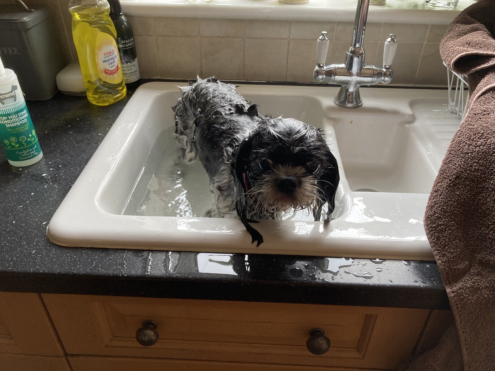 She'd had a good blasting with the garden hose before the final shampoo and set. Do it all the time with that one.But why wash the dog in your sink? Not very hygenic.