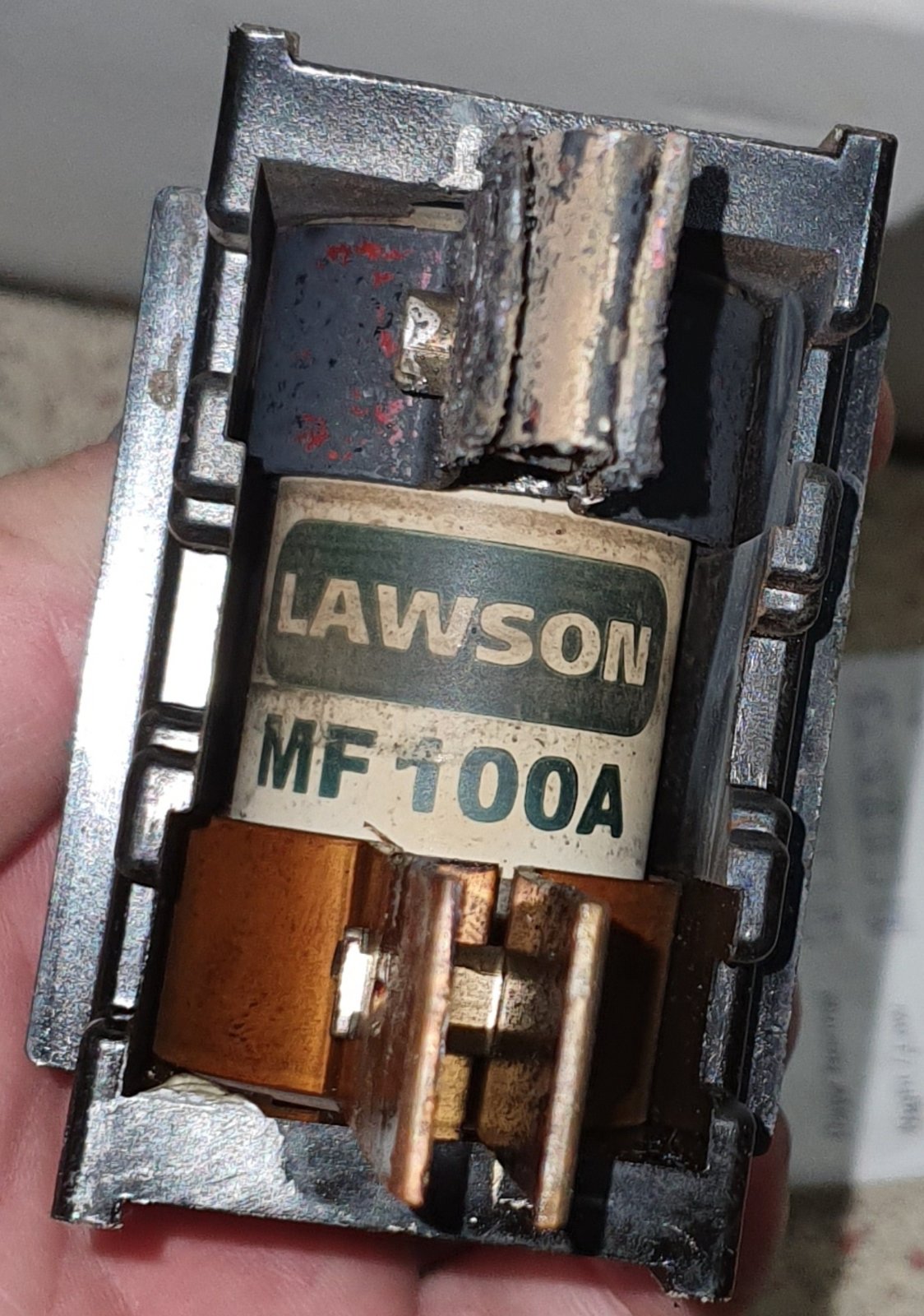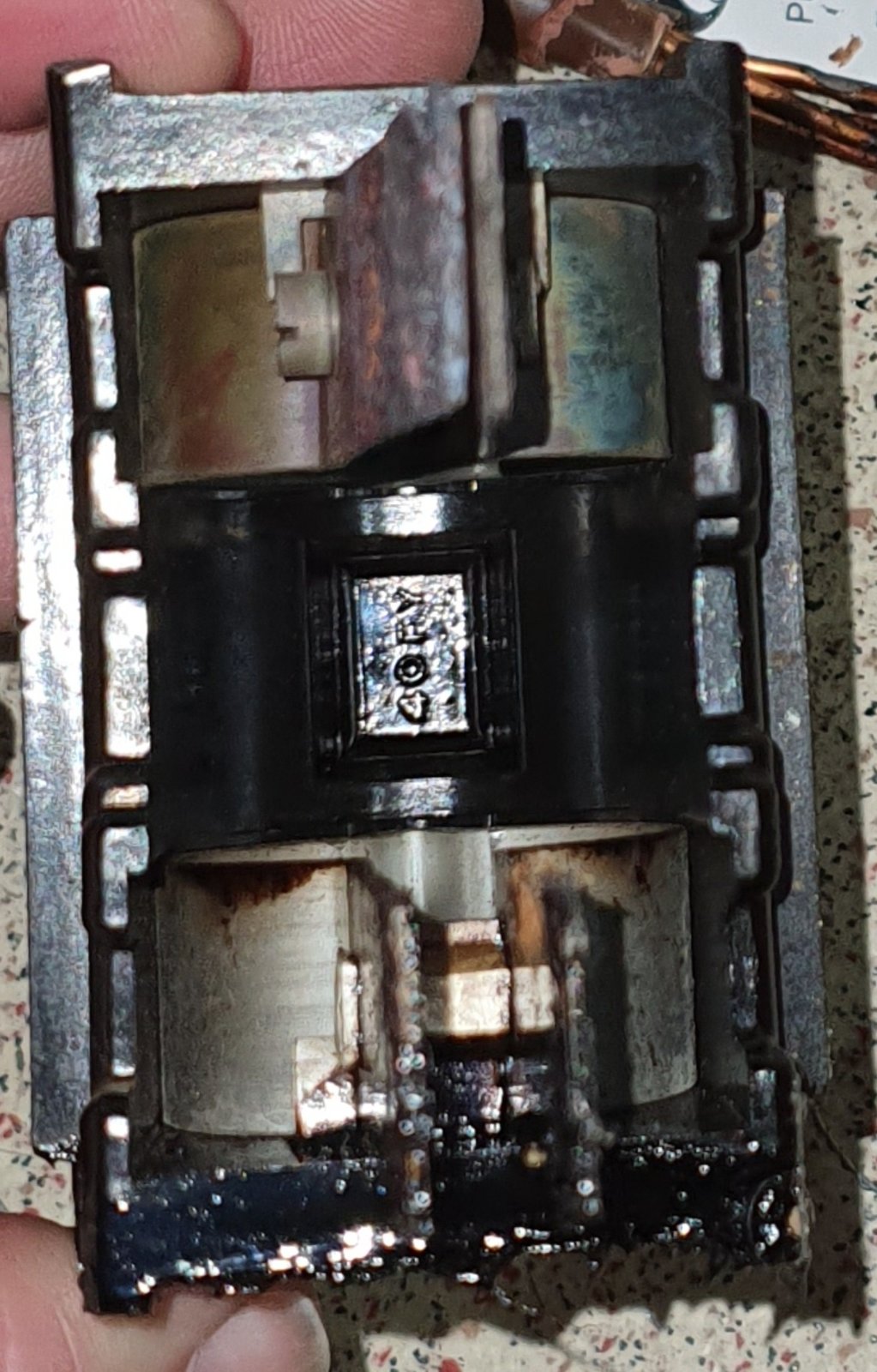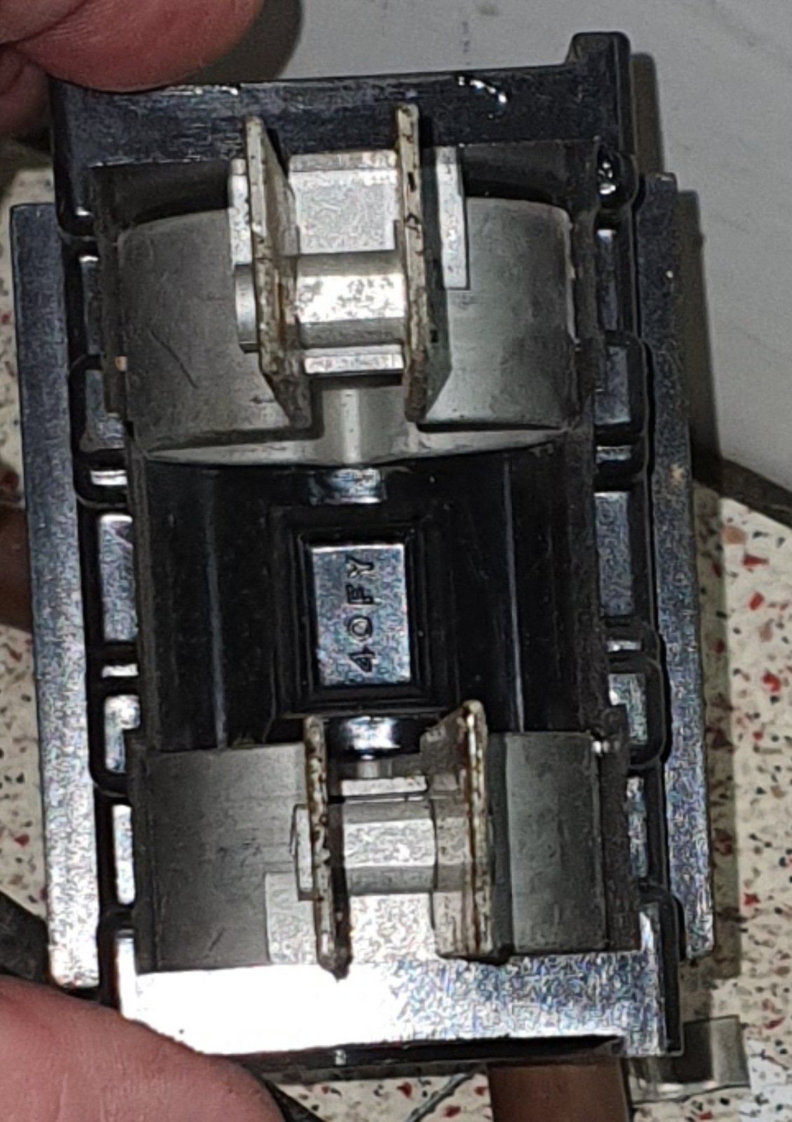 Here comes the anomaly, the top pins on the fuse were sprung, the bottom ones were not. Because of this, a fuse carrier without guides was used, which is probably why the bottom pins bent.